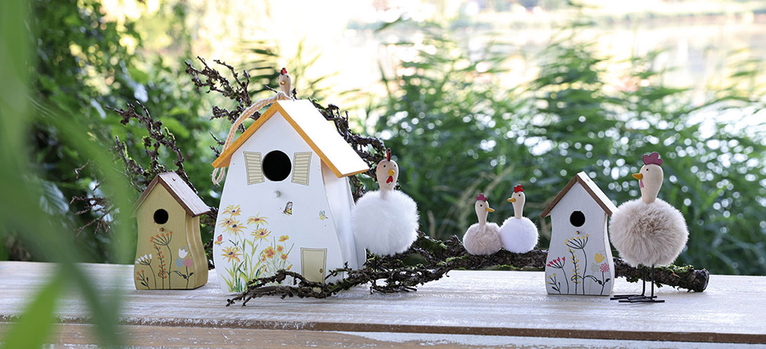 Ontdek meer...Frisse lente paasversieringen - konijntjes en kippen, kuikens en vele andere decoratieve figuren voor de lente
