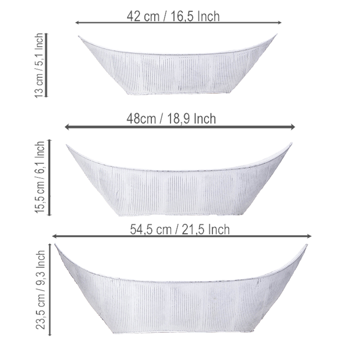 Voeg een vleugje elegantie toe aan uw huis of balkon met onze witte/zilveren metalen plantenbak in de vorm van een boot. Deze set van drie stapelbare plantenbakken is niet alleen functioneel veelzijdig, maar heeft ook een esthetische waarde die elke omgeving verfraait. Deze plantenbak is gemaakt van hoogwaardig witgekalkt metaal dat liefdevol is afgewerkt in een retro-vintage stijl, waardoor de originele zilveren kleur op kunstzinnige wijze zichtbaar is. Het geeft de kommen een unieke uitstraling die perfect tot zijn recht komt in nostalgische decoraties. De brede mond, die naar de grond toe taps toeloopt, zorgt voor een stabiele stand die ook geschikt is voor weelderige beplanting. Als decoratieve tafeldecoratie voor evenementen of als stijlvolle bloemenschalen in de tuin – deze set is een must-have voor creatieve geesten en decorateurs. Ontdek hoe onze elegante metalen plantenbakken uw huis of buitenruimte kunnen verfraaien.