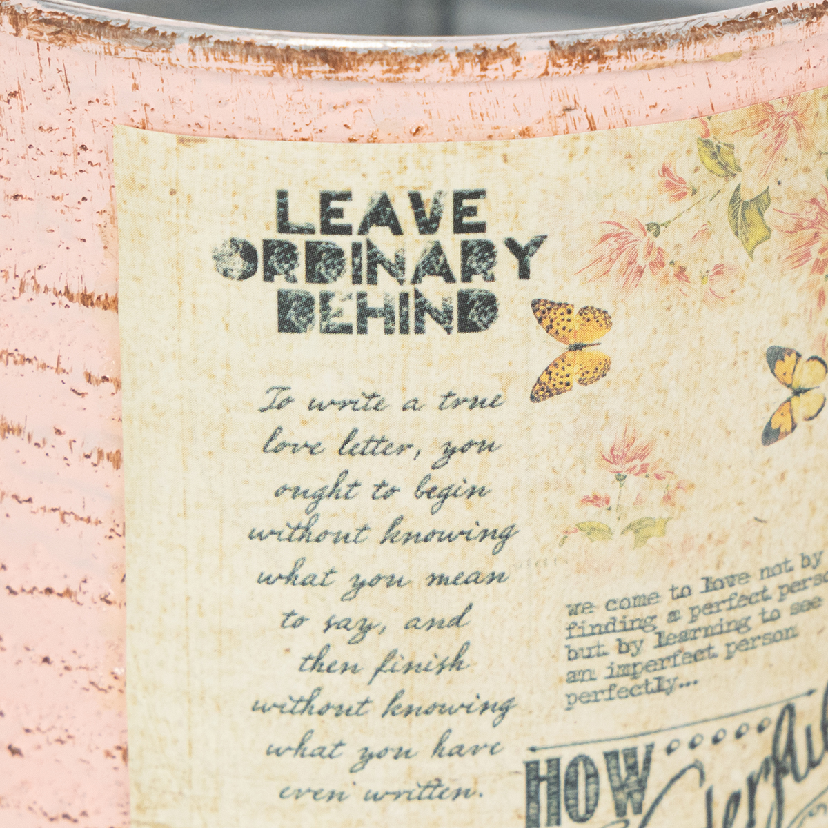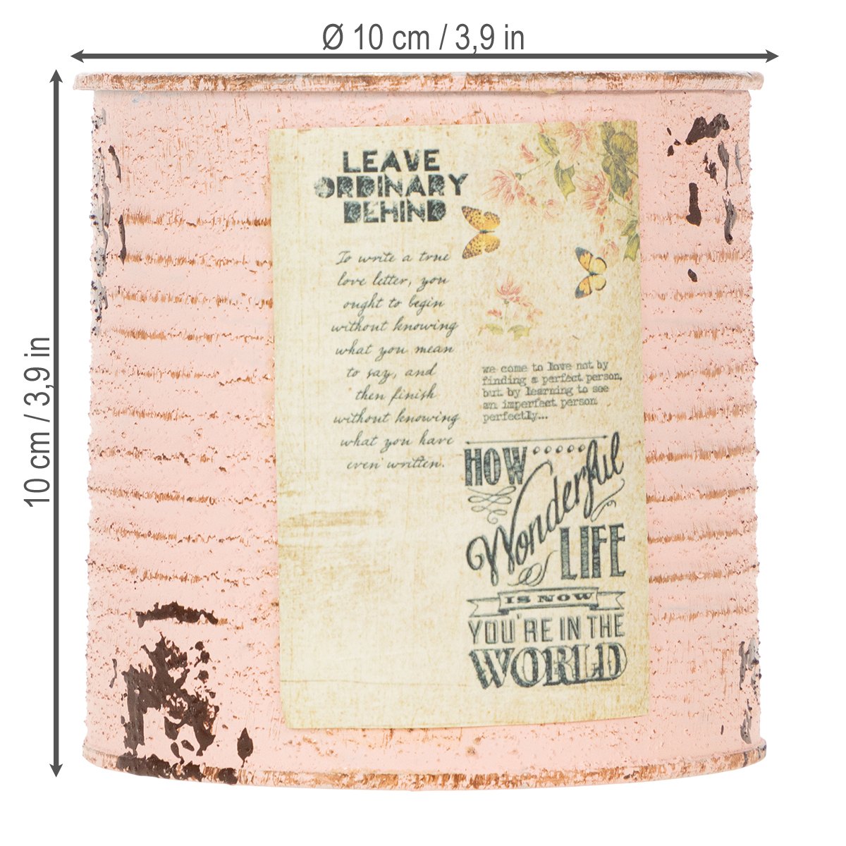 De bloempot gemaakt van een decoratief blik in de pastelkleur zalm is minstens zo sfeervol als een echt vintage blikje. De zomerdecoratie van metaal heeft echter het beslissende voordeel dat hier geen scherpe randen zijn. Op deze manier kunt u het blik zonder risico op verwonding planten. Een roestbruine tint komt van onder de geborstelde pastelkleur op de groeven van het blik. Daarnaast benadrukken geschilderde roestvlekken en een nostalgisch label de shabby chic van het retro blikje. Het interieur van de sierpot is heel eenvoudig in zilver gehouden.