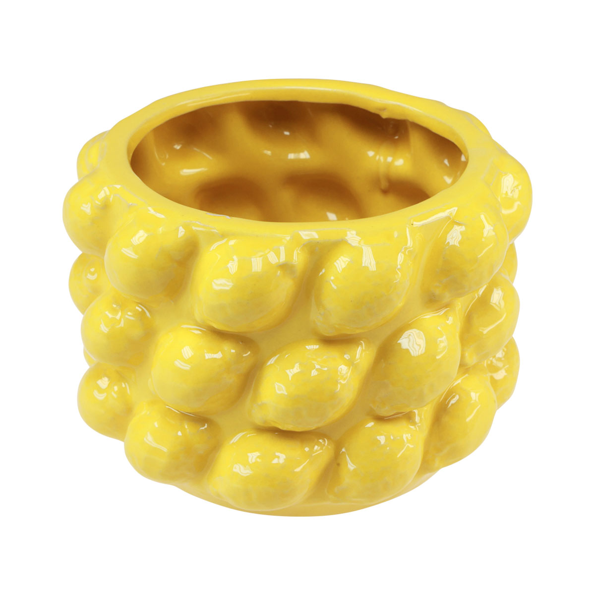 Deze unieke citroenvaas is geel geglazuurd en doet onmiddellijk denken aan mediterrane citrusvruchten. De sculpturale vormgeving van de buitenkant met veel kleine citroenen geeft de plantenbak een levendige uitstraling.