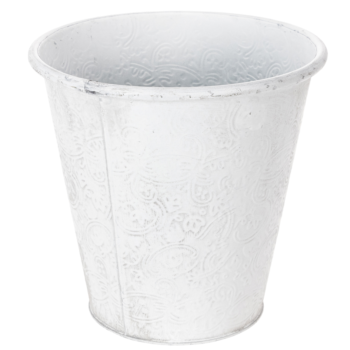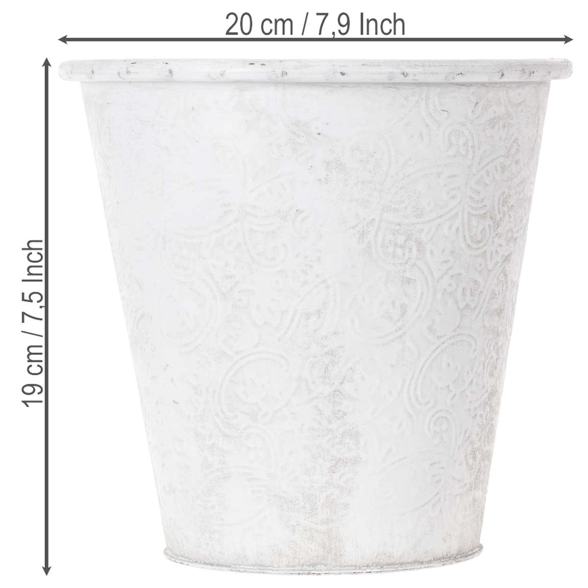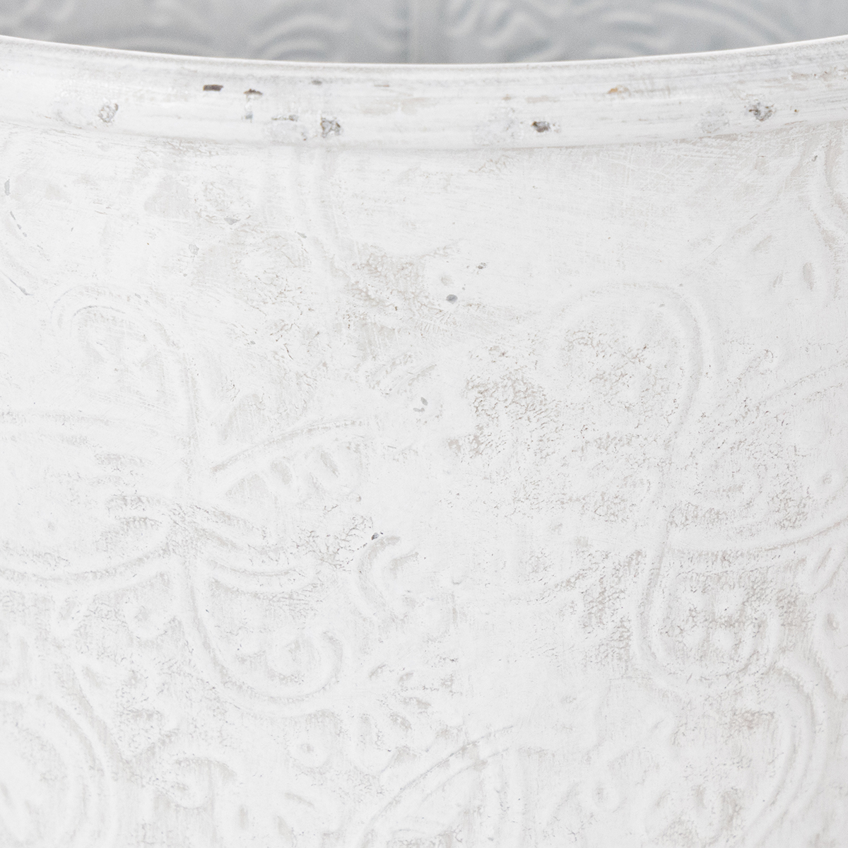 De sprookjesachtige cachepot is versierd met ornamenten: de metalen decoratie is rondom gebosseleerd met bloemenbloemen. Met zijn romantische uitstraling en de white wash in trendy shabby chic past het metalen vat ook heerlijk als tafeldecoratie in vintage stijl voor een bloemendecoratie voor een bruiloft!