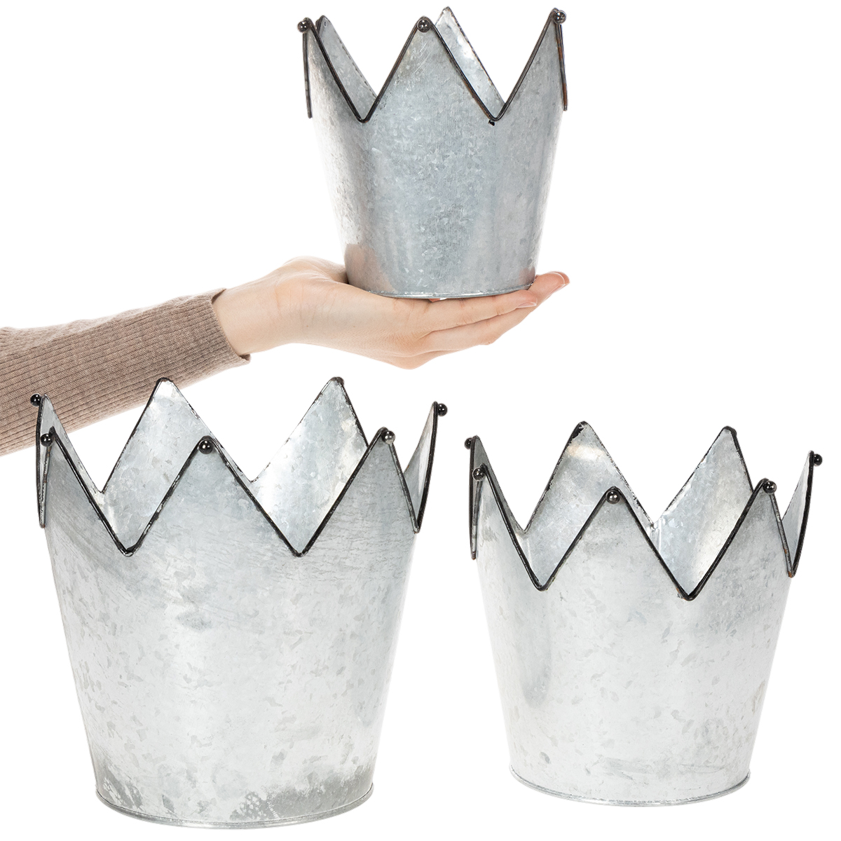 Verfraai uw vensterbanken en ladekasten met deze drie kroonvormige plantenbakken! De decoratieve kronen zijn gemaakt van metaal, meer bepaald zink.