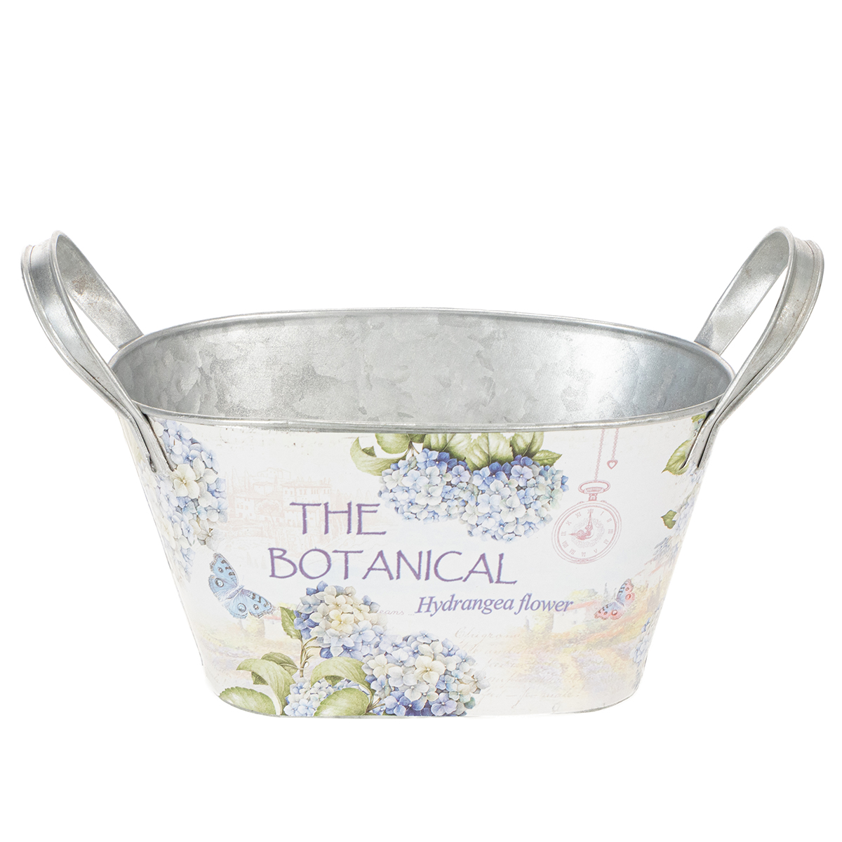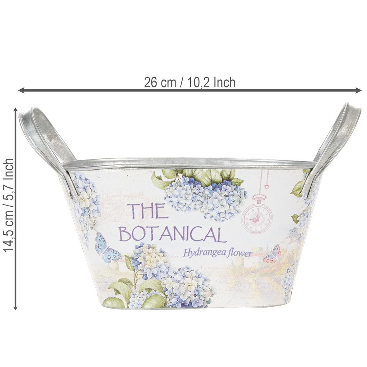 De gedetailleerde print met het nostalgische hortensiamotief is zorgvuldig op de metalen schaal aangebracht en wekt de indruk dat deze rechtstreeks op het vat is gedrukt. De elegant gebogen handgrepen, gegalvaniseerd in zilver, geven de decoratieve schaal extra verfijning.