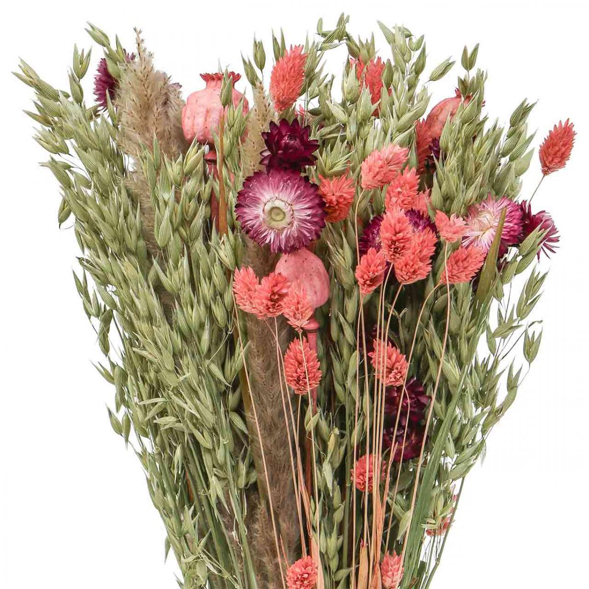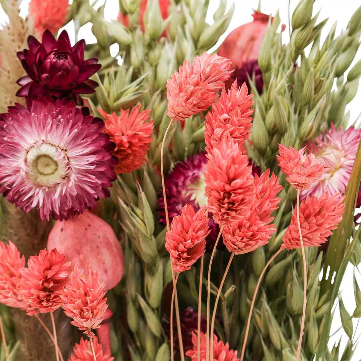 Hier krijg je een boeket droogbloemen in grote contrasten: strobloemen en geverfde papavercapsules evenals phalaris in roze harmoniëren heel goed met natuurlijk graan in de vorm van stengels van groene haver en gedroogde zegge.