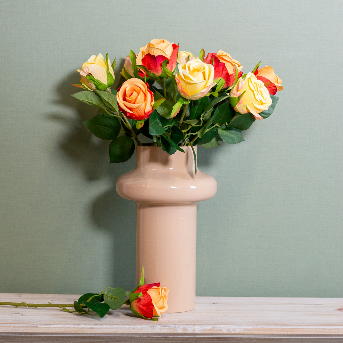Wie kent dit niet? Een stijlvol ingerichte woonkamer, een uitnodigende sfeer aan de eettafel of een elegante ambiance op kantoor – allemaal met een vleugje natuurlijkheid. Maar echte bloemen verwelken snel en de verzorging ervan kan tijdrovend zijn. Met ons boeket kunstrozen in stralend geel brengt u de perfecte combinatie van duurzaamheid en schoonheid in huis. Of het nu als accent op de eettafel is of als blikvanger op de commode, deze decoratieve kunstbloemen fleuren elke ruimte op. Zoekt u iets dat onderhoudsarm, van hoge kwaliteit en stijlvol is? Dan is dit boeket kunstrozen de perfecte keuze!