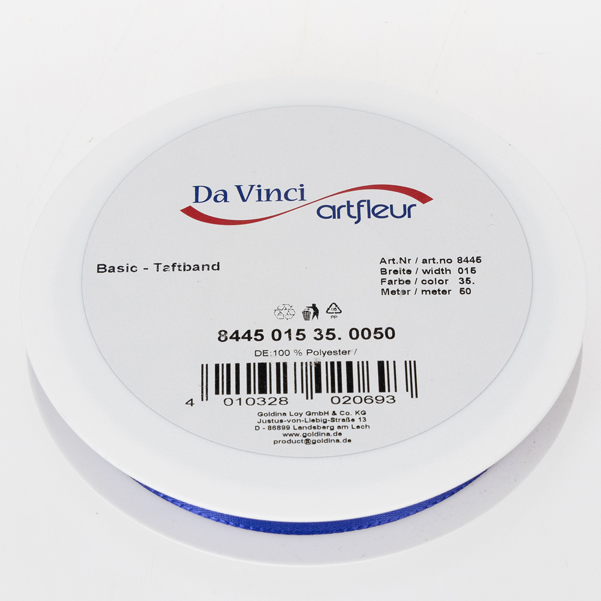 Het mooie cadeau- en decoratielint in donkerblauw is ongeveer 15 millimeter breed en ongeveer 50 meter lang. Het is gemaakt van 100% polyester en wordt geleverd op een handige, platte kunststof spoel.