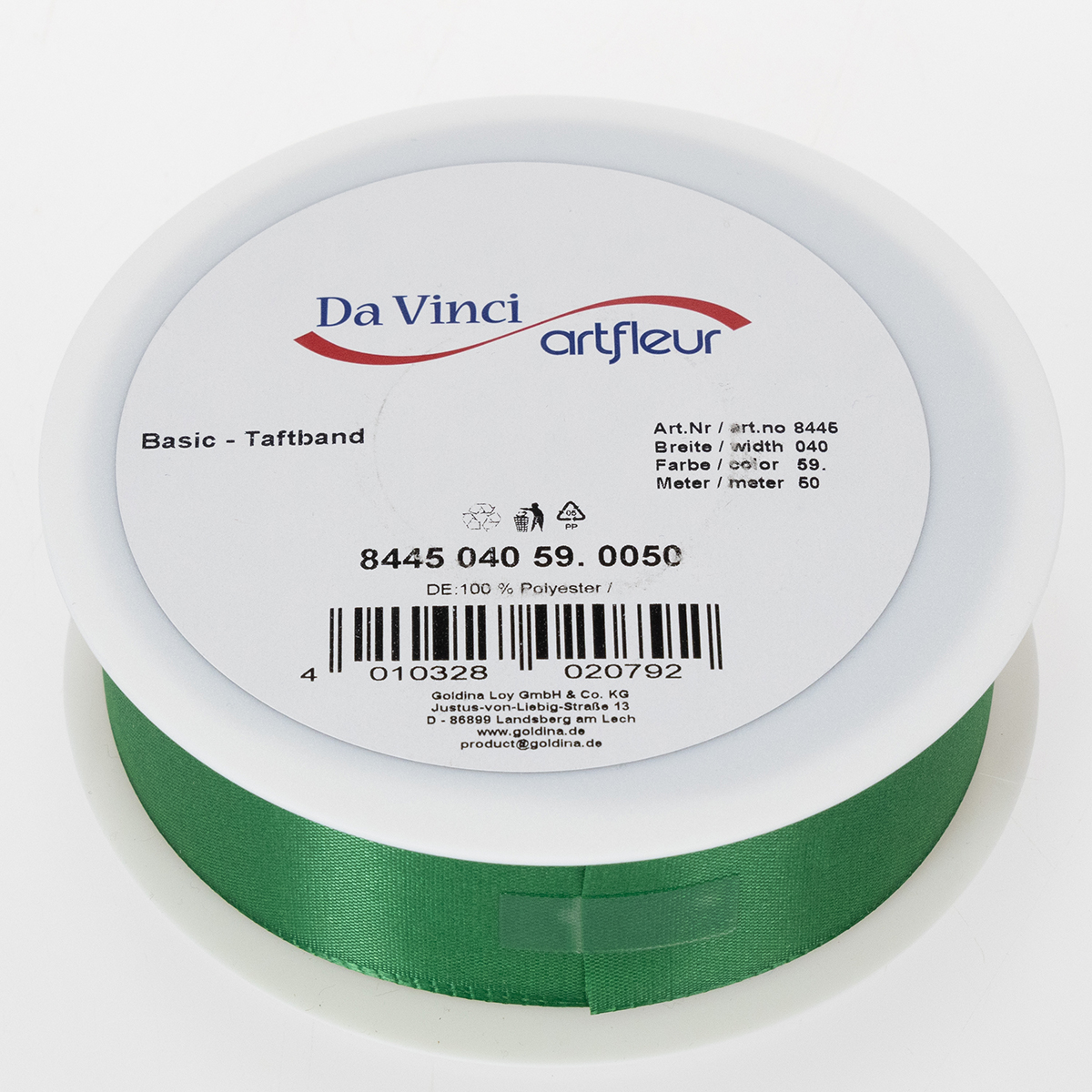 Het cadeau- en decoratielint in donkergroen is bevestigd aan een plastic rol met zijn ongeveer 50 meter. De breedte is ongeveer 40 millimeter.