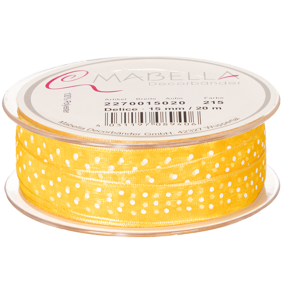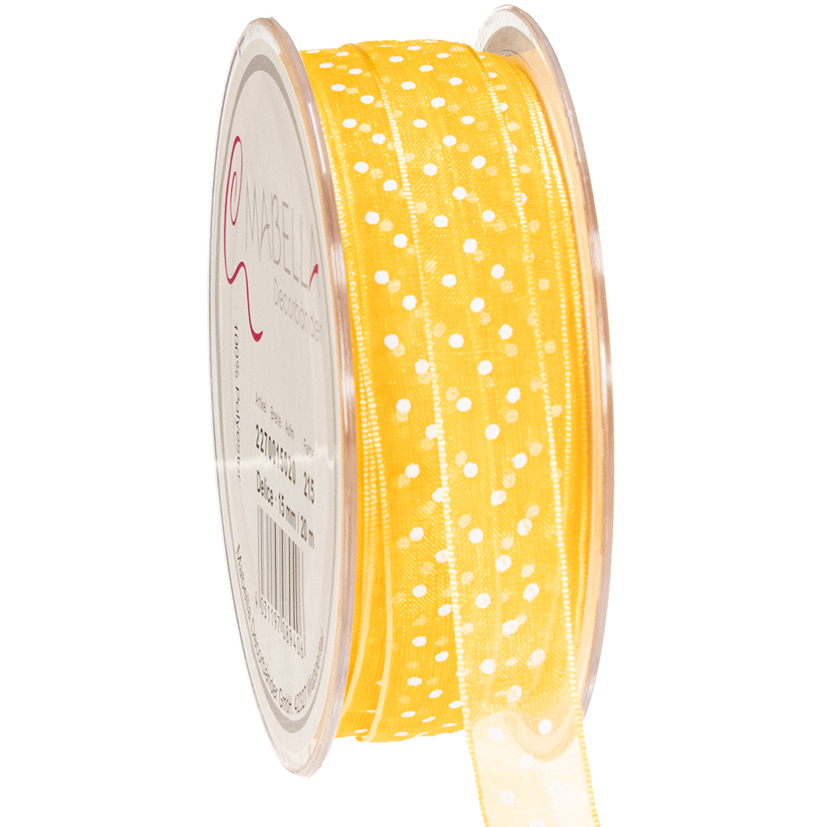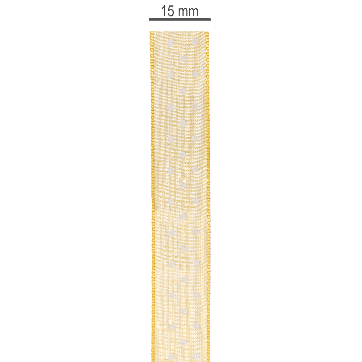 Het gele cadeaulint met de witte stippen is gemaakt van 100% polyester en meet ongeveer 25 millimeter breed en ongeveer 20 meter lang. Je krijgt het op een kleine, handige spoel van plastic, die je gemakkelijk in een lade of in de naaimand kunt bewaren.