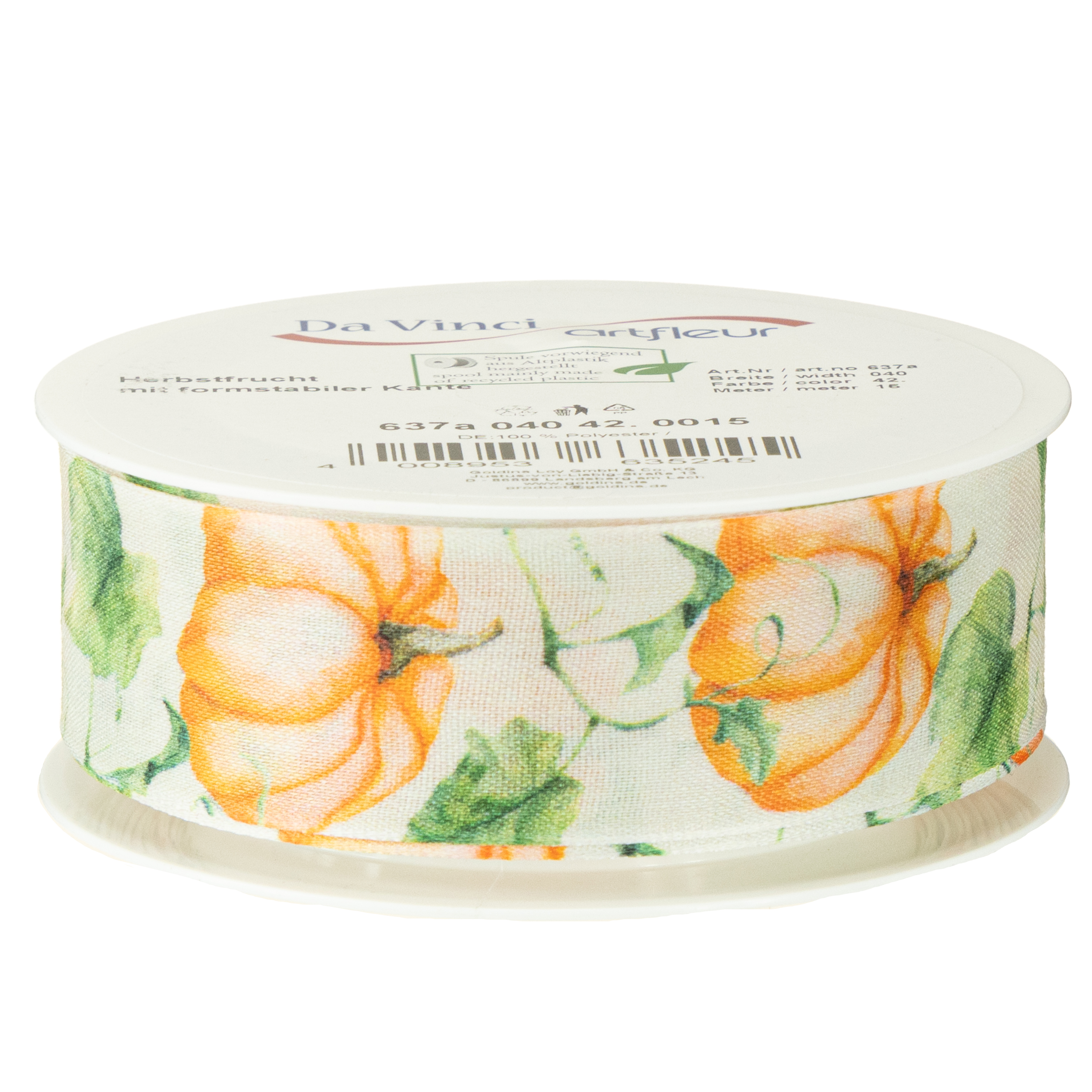 Het lint is bedrukt met een gedetailleerd pompoenmotief. Bladeren en ranken zijn schilderachtig gerangschikt rond de oranje herfstvruchten. Bovendien blijkt het sierlint een kwaliteitsproduct te zijn dankzij de vormvaste zelfkant.