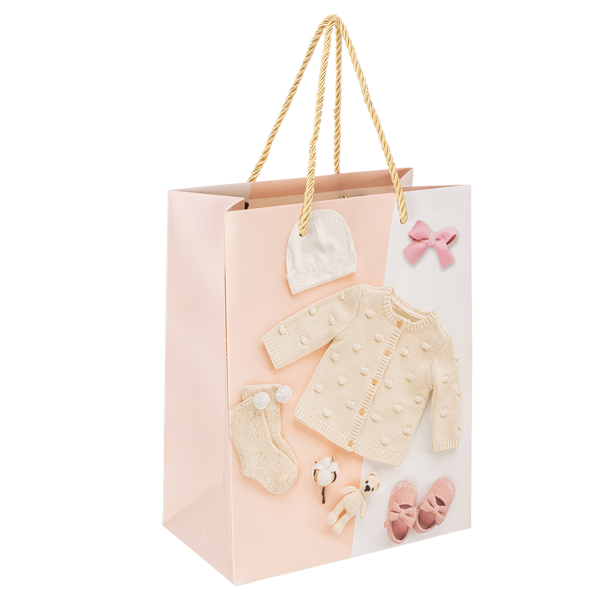 De cadeauzakjes hebben een gevarieerd design met vestjes, babyslofjes, flesjes en vele andere leuke accessoires voor baby's. Glittereffecten op de papieren zakjes accentueren details en zorgen voor extra magie in uw geschenkverpakking.