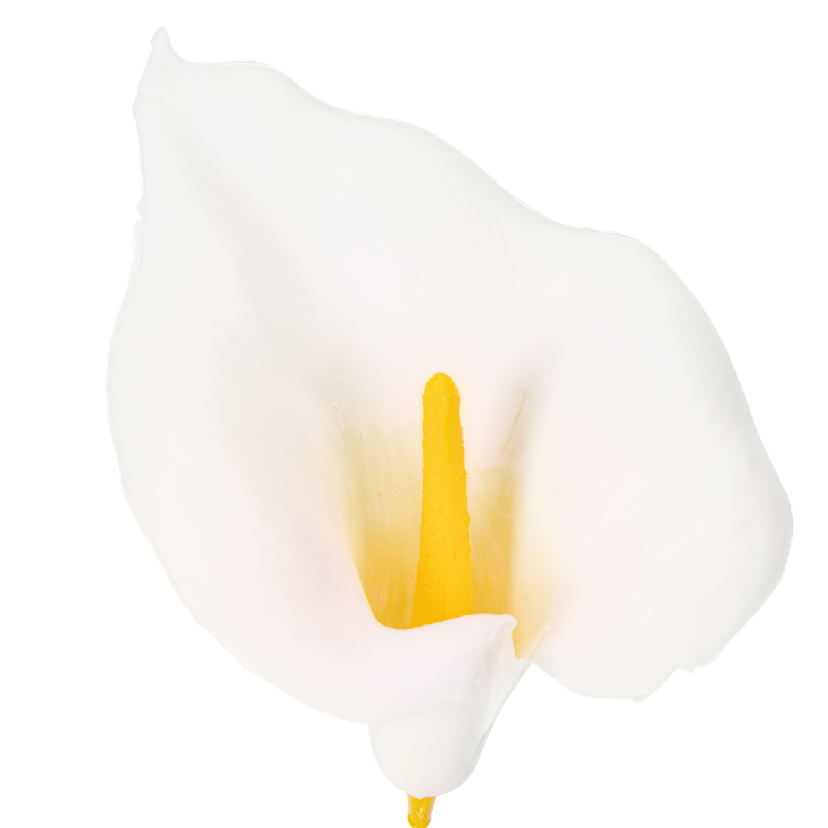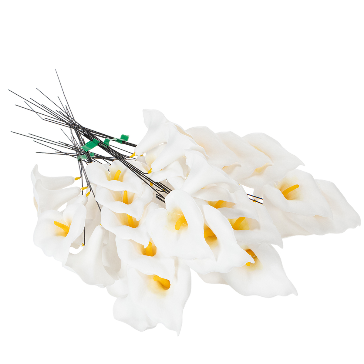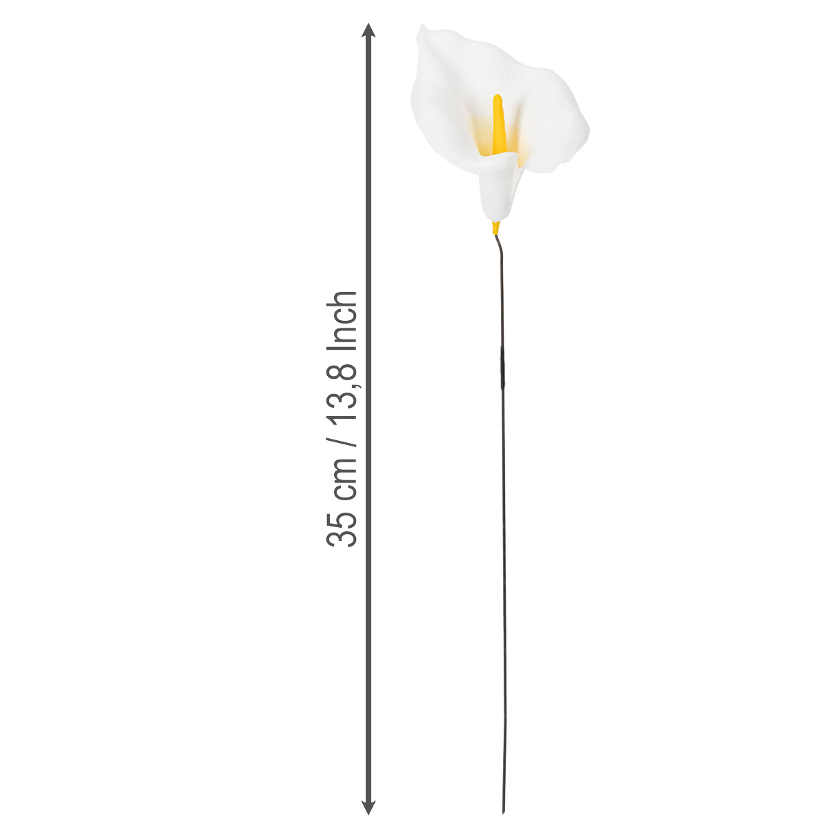 De kleine calla op de draad in het wit zit in een zak van 50 stuks. De totale lengte van elke kunstmatige moeras calla is ongeveer 35 centimeter, de bruine en flexibele metaaldraad is ongeveer 27 centimeter lang. De witte bloemkop heeft een lengte van ongeveer 10 centimeter en heeft in het midden ook een zeer mooi nagebootste gele pollenstaaf, waarvan de omringende trechter ook enigszins geel van kleur is.
