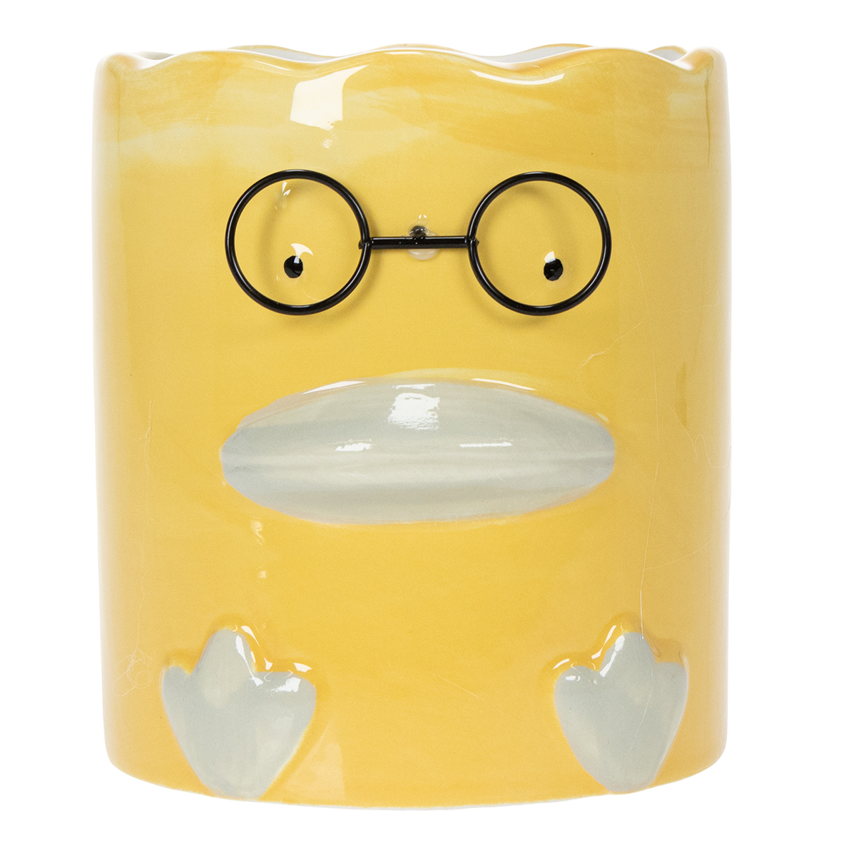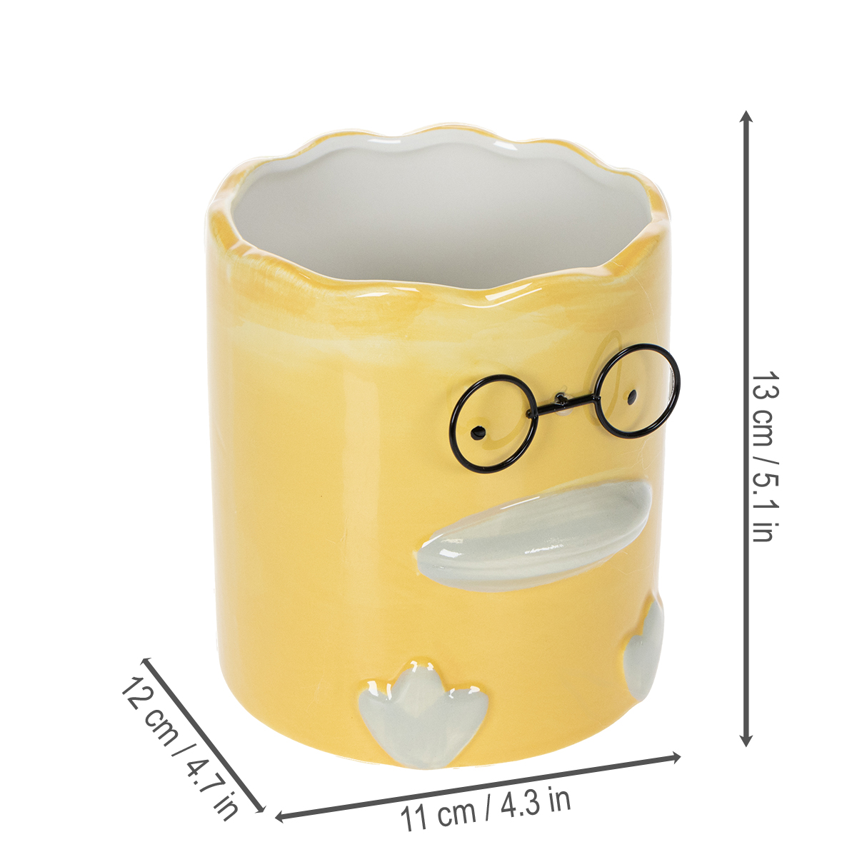 Deze gele keramische vaas met dierenmotief combineert functionaliteit en esthetiek op een bijzondere manier. Met een hoogte van 13 cm en een diameter van 12 cm biedt hij voldoende ruimte voor bloemen, gedroogde bloemen of zelfs pennen en kantoorartikelen. Het hoogwaardige keramiek zorgt voor stabiliteit en duurzaamheid, terwijl het charmante eendje, met zijn delicate details zoals de golvende opening en de speelse bril, een moderne en humoristische touch geeft. Deze vaas is ideaal voor het presenteren van lichtgekleurde gedroogde bloemen of verse snijbloemen. Voor een natuurlijker effect kunt u er ook kleine kamerplanten zoals vetplanten in zetten. Hij is ook perfect voor het opbergen van pennen of andere kleine spullen, waardoor het een praktische toevoeging is aan een kantoor of kinderkamer. Dit decoratieve object is niet alleen een mooie aanwinst voor uw eigen huis, maar ook een geweldig cadeau-idee voor vrienden of een housewarming. Een perfecte mix van praktisch gebruik en decoratieve schoonheid!