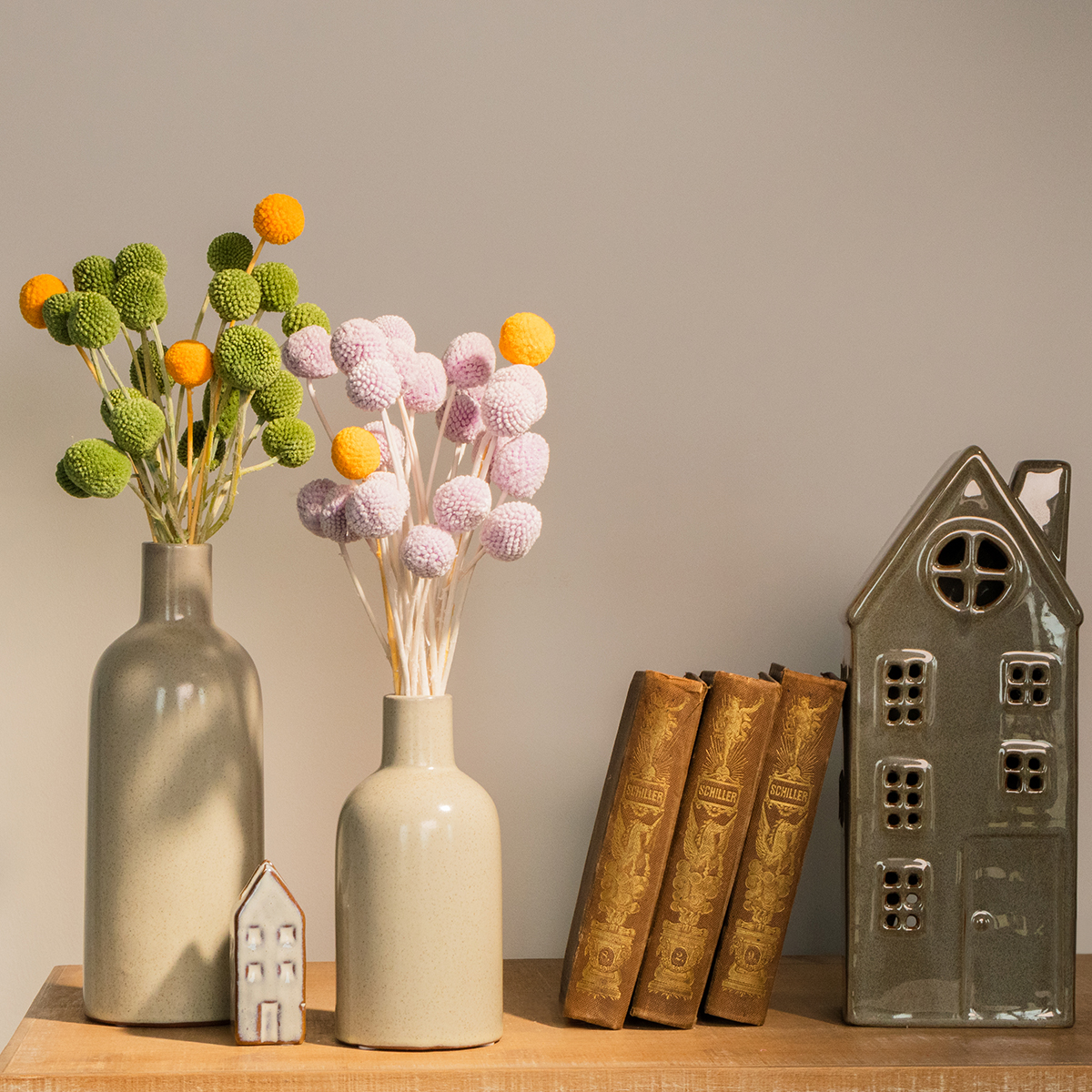 Deze gedroogde drumstickbloemen zijn gemakkelijk te verzorgen, gaan lang mee en zijn bovendien praktisch: stof ze voorzichtig af met een zachte doek en ze behouden hun natuurlijke schoonheid maandenlang. Belangrijk: om de kleurintensiteit te behouden, plaatst u de bloemen alleen binnenshuis of op een beschutte plek buiten.