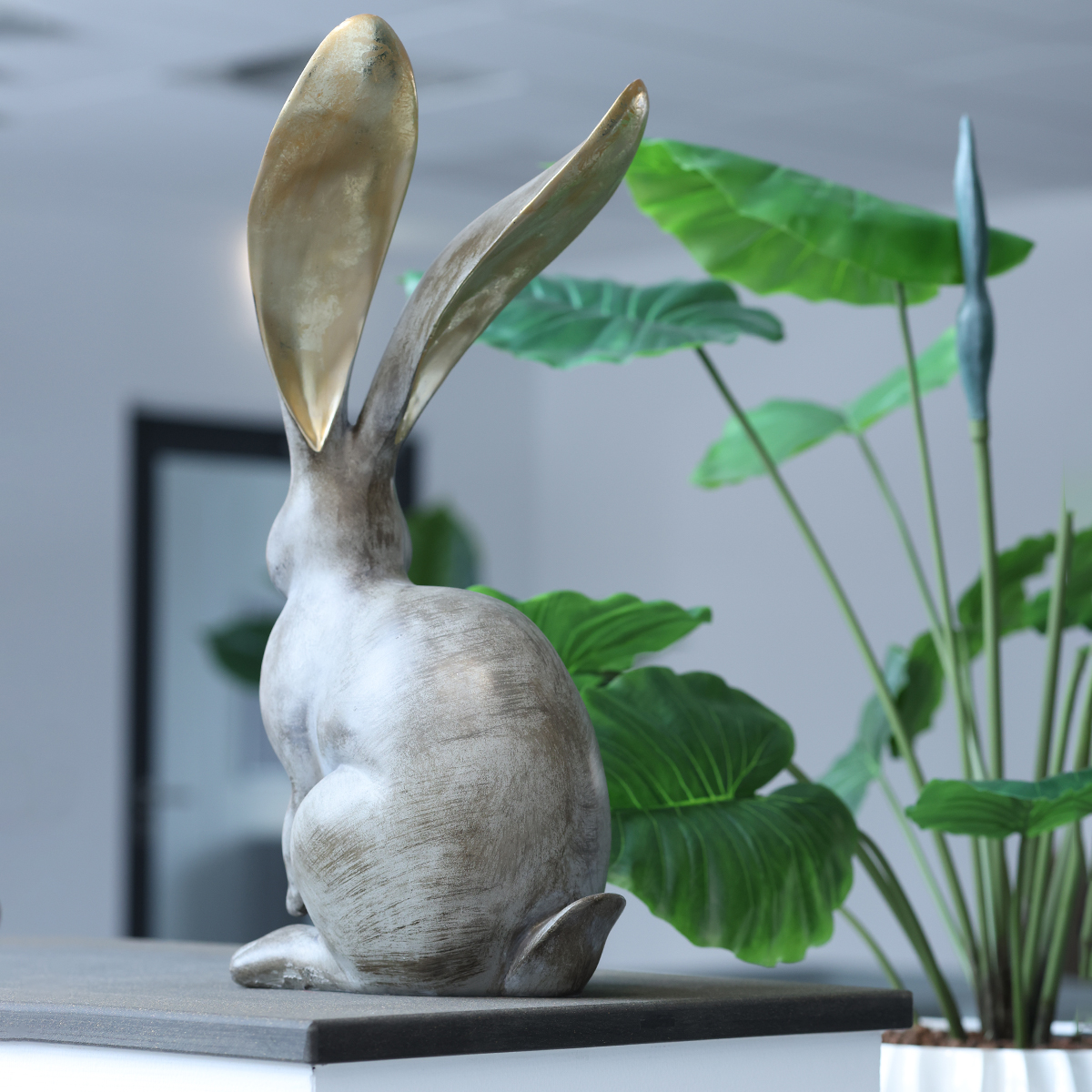 De lente is hét seizoen om te decoreren! Zoekt u een bijzonder pronkstuk voor uw paas- of lentedecoratie? Ons decoratieve konijn, met een indrukwekkende hoogte van 52 cm, zou wel eens precies datgene kunnen zijn wat uw decoratiedroom compleet maakt. Met zijn elegante ontwerp en uitzonderlijk lange, gouden oren is dit konijnenbeeldje niet alleen een echte blikvanger, maar ook een toonbeeld van tijdloze esthetiek. Of het nu in de woonkamer, hal of buiten in de tuin staat – dit konijn geeft elke ruimte een vleugje verfijnde charme.