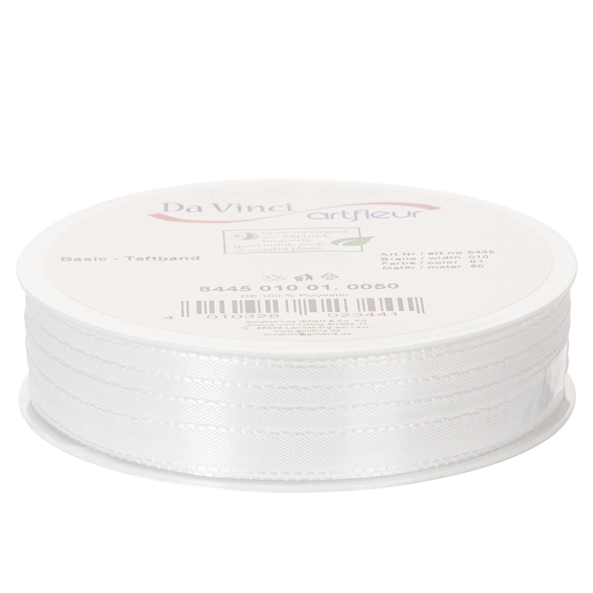 Het witte decoratieve lint is opgerold op een plastic rol met een totale lengte van 50 meter en een breedte van 10 millimeter.