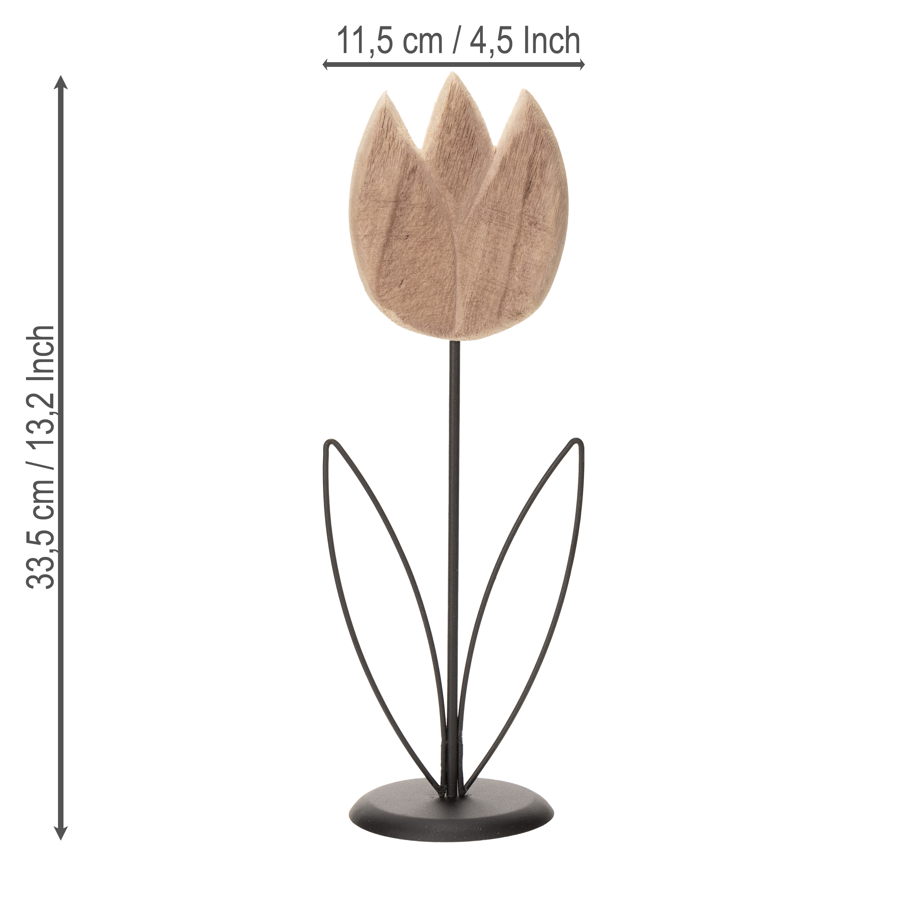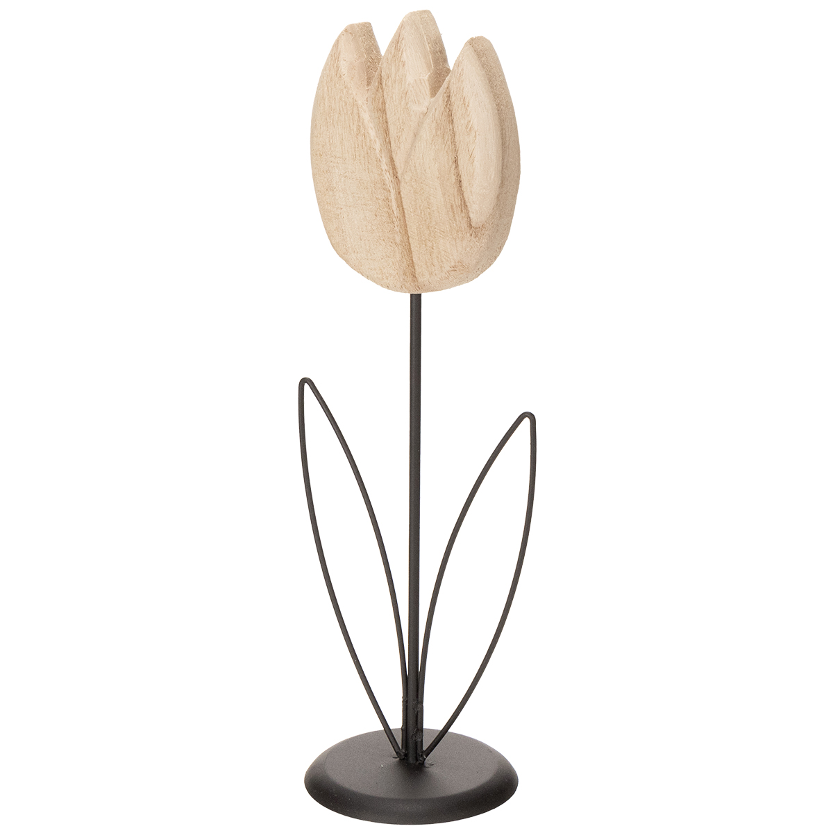 Deze decoratieve tulp onderscheidt zich door zijn eenvoudige maar expressieve ontwerp. De tulpvormige kop is gemaakt van hoogwaardig hout, waarvan de natuurlijke nerf een bijzonder authentieke uitstraling geeft. De bladeren, steel en voet zijn gemaakt van stevig metaal, wat zorgt voor stabiliteit. Of u nu de voorkeur geeft aan een moderne, Scandinavische of tijdloze interieurstijl, deze decoratieve tulp past naadloos in elke omgeving. Hij komt vooral mooi tot zijn recht in combinatie met andere decoratieve items van metaal of hout – bijvoorbeeld in een klein arrangement met kaarsen of vazen.