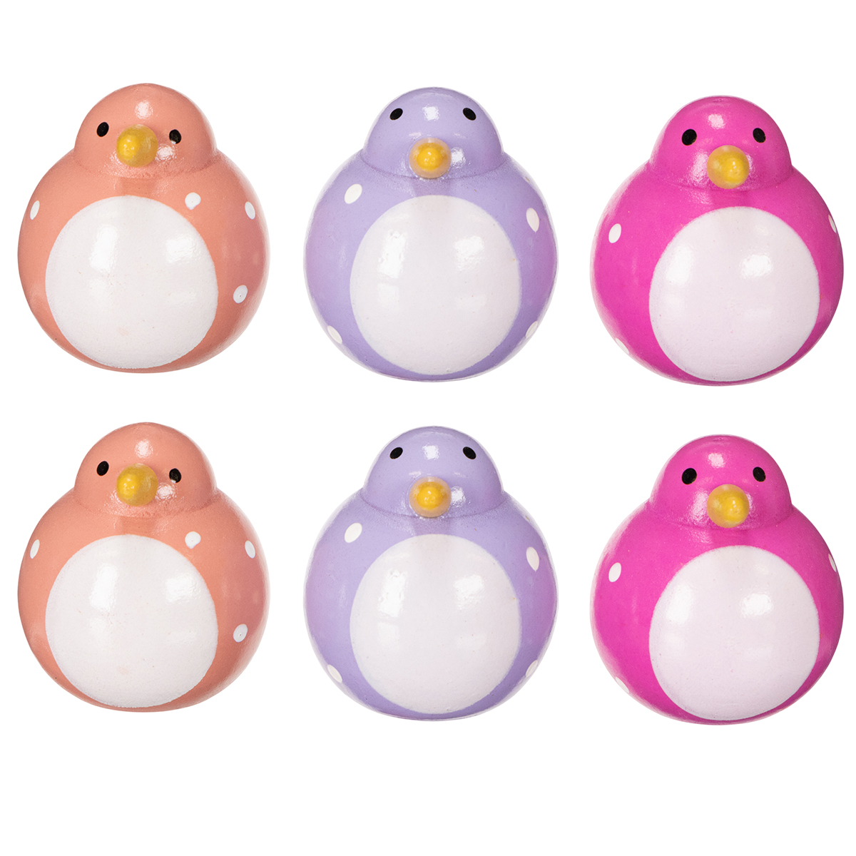 Deze set van zes kleine decoratieve vogelbeeldjes is op het eerste gezicht betoverend! De beeldjes zijn met liefde gemaakt en verkrijgbaar in drie kleuren: paars, roze en lichtroze, wat een harmonieuze maar levendige kleurencombinatie oplevert. Met een hoogte van 6 centimeter passen ze perfect in elke decoratie en zijn ze extra charmant dankzij hun schattige stippenpatroon. De combinatie van zacht paars met de opvallende accenten van de andere kleuren geeft de vogels een subtiele én expressieve uitstraling.