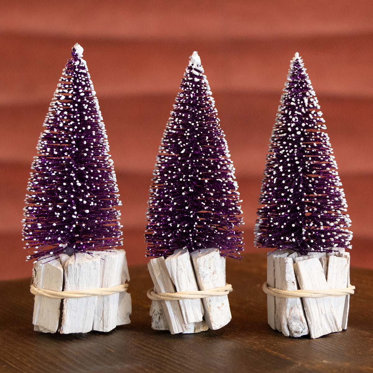 Productnaam: Decoratieve kerstboom in paars met sneeuwpunt op een rustieke houten voet 15cm 3 stuks.