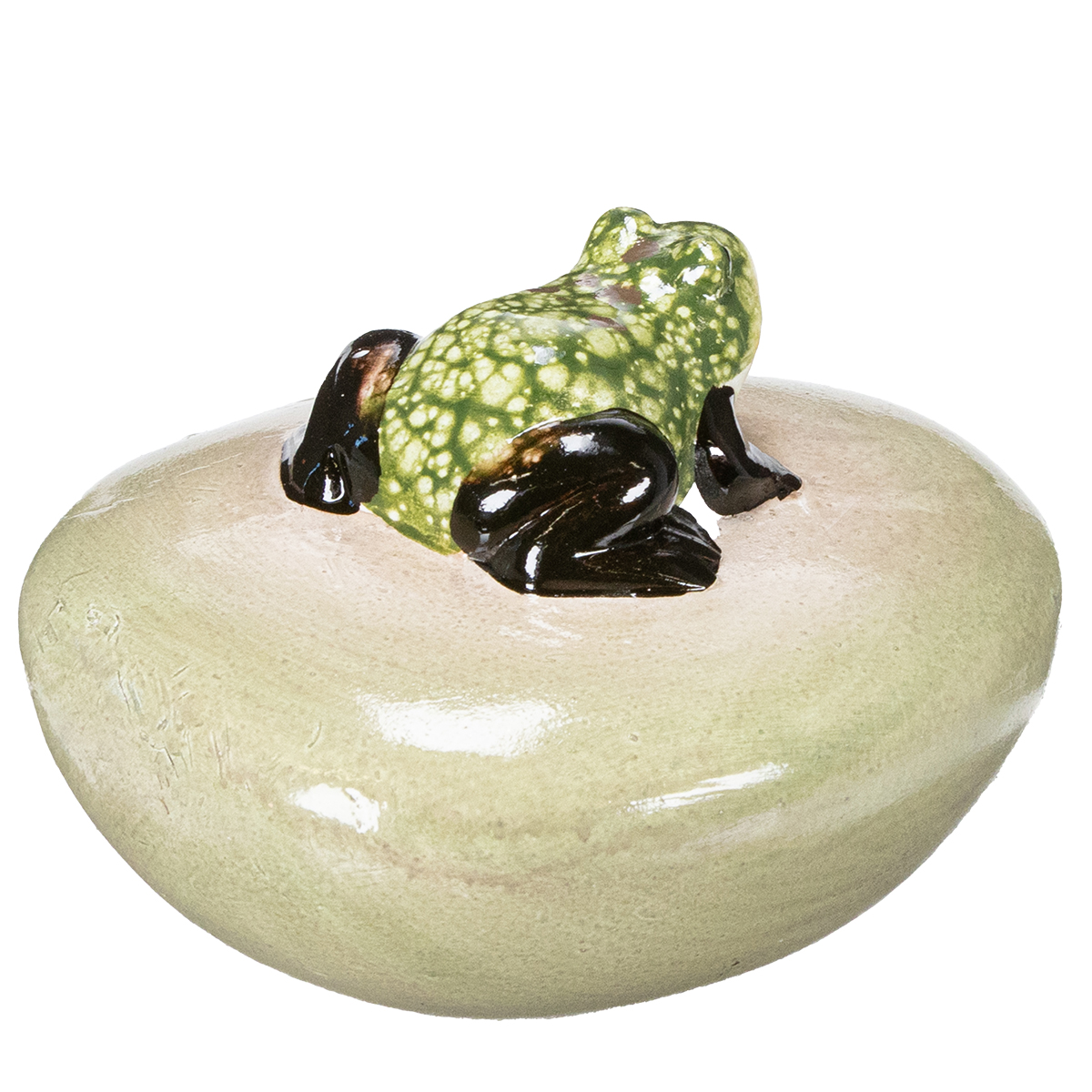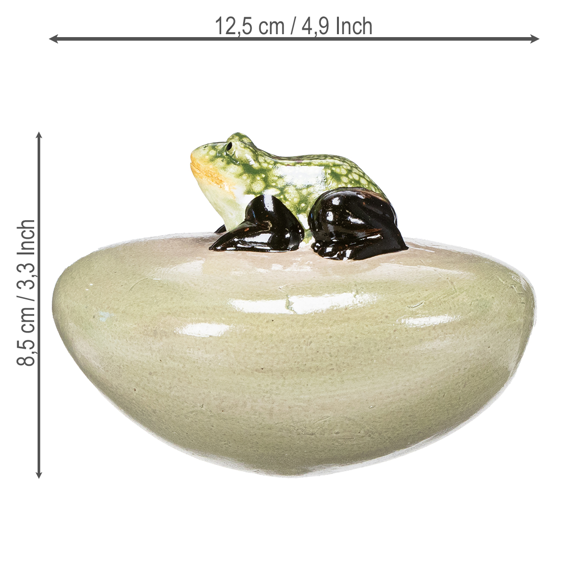 Deze decoratieve kikker op een steen is al snel een blikvanger in elke kamer of tuin. Met een hoogte van 11 cm en een diameter van 13 cm heeft hij de perfecte afmetingen om zowel prominent als subtiel te gebruiken. Het hoogwaardige keramische materiaal garandeert robuustheid en duurzaamheid, en dankzij de weerbestendige eigenschappen kan dit beeldje het hele jaar door zonder zorgen buiten blijven staan. De groene kleur van het keramiek roept de frisheid van de natuur op en harmonieert prachtig met andere planten, stenen of decoratieve elementen. Voor een speelsere touch kan de kikker in waterbakjes of vijvers worden geplaatst, waar hij schittert als drijvend decoratief object. Hij staat ook prachtig op de vensterbank, in kleine tuinarrangementen of zelfs als bureaudecoratie. Het ontwerp past perfect bij een natuurlijke landelijke stijl en kan ook prachtig gecombineerd worden met Scandinavische of mediterrane stijlen. Op zoek naar een harmonieus geheel? Combineer de kikker met andere keramische elementen zoals kleine potjes of vogelmotieven. Decoratieve theelichthouders of gekleurde glazen steentjes zijn ook uitstekende aanvullingen. Met een groepje van drie figuren, zoals deze, kun je prachtige scènes creëren – op het terras, in de tuin of als blikvanger in een bloempot.