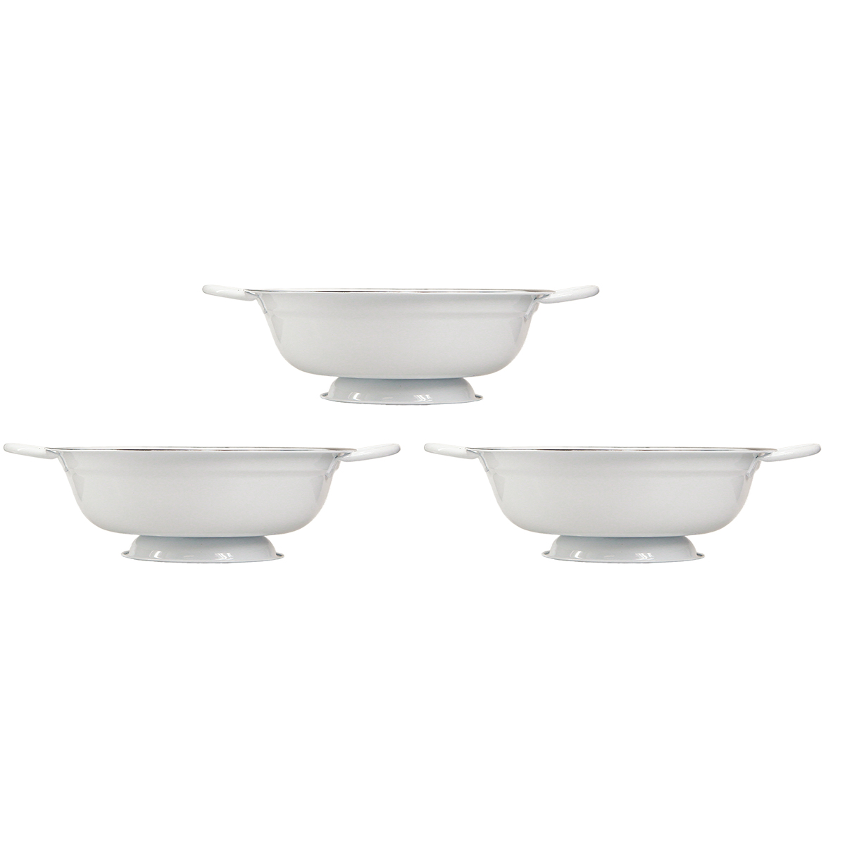 Onze metalen sierschalen in wit/zwart combineren stijlvolle elegantie met nostalgische charme en zijn de perfecte metgezel voor uw tafel- en kamerdecoratieprojecten. Deze metalen schalen overtuigen door hun zacht gebogen vorm en verfijnde emaille-look, die elke ruimte meteen een vintage tintje geeft. De drie schalen hebben elk een diameter van ongeveer 20,5 cm en zijn veelzijdig inzetbaar. Of het nu gaat om een ronde plantenschaal voor liefdevol gearrangeerde bloemstukken of als stijlvolle opberger voor kleine accessoires - deze schalen zetten altijd accenten.