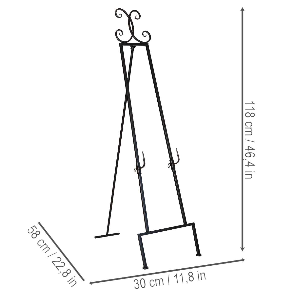 Deze zwarte metalen kransstandaard combineert elegantie en functionaliteit op perfecte wijze. De stevige constructie en het eenvoudige maar stijlvolle ontwerp maken het de ideale accessoire voor kerstversieringen, bruiloften of zelfs als subtiel accent in een hal. Met een weloverwogen hoogte van 118 centimeter vestigt hij de aandacht op uw decoratieve elementen zonder zelf opdringerig te zijn.