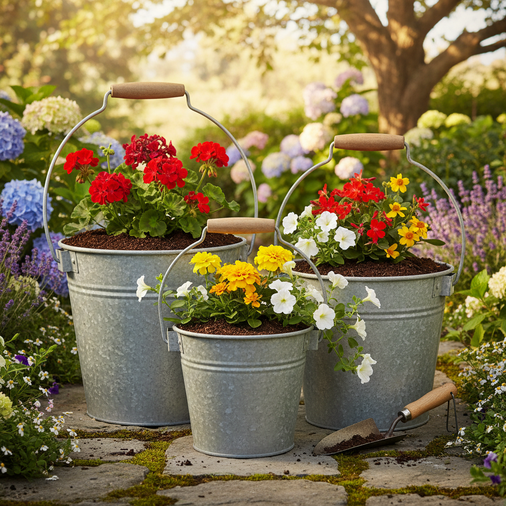 Ontdek onze decoratieve emmers in vintage stijl, die er niet alleen goed uitzien als metalen plantenpotten. De set bevat drie maten (Ø15/17,5/22cm), perfect voor elke hoek van je huis, balkon of tuin om een nostalgische flair op te roepen.