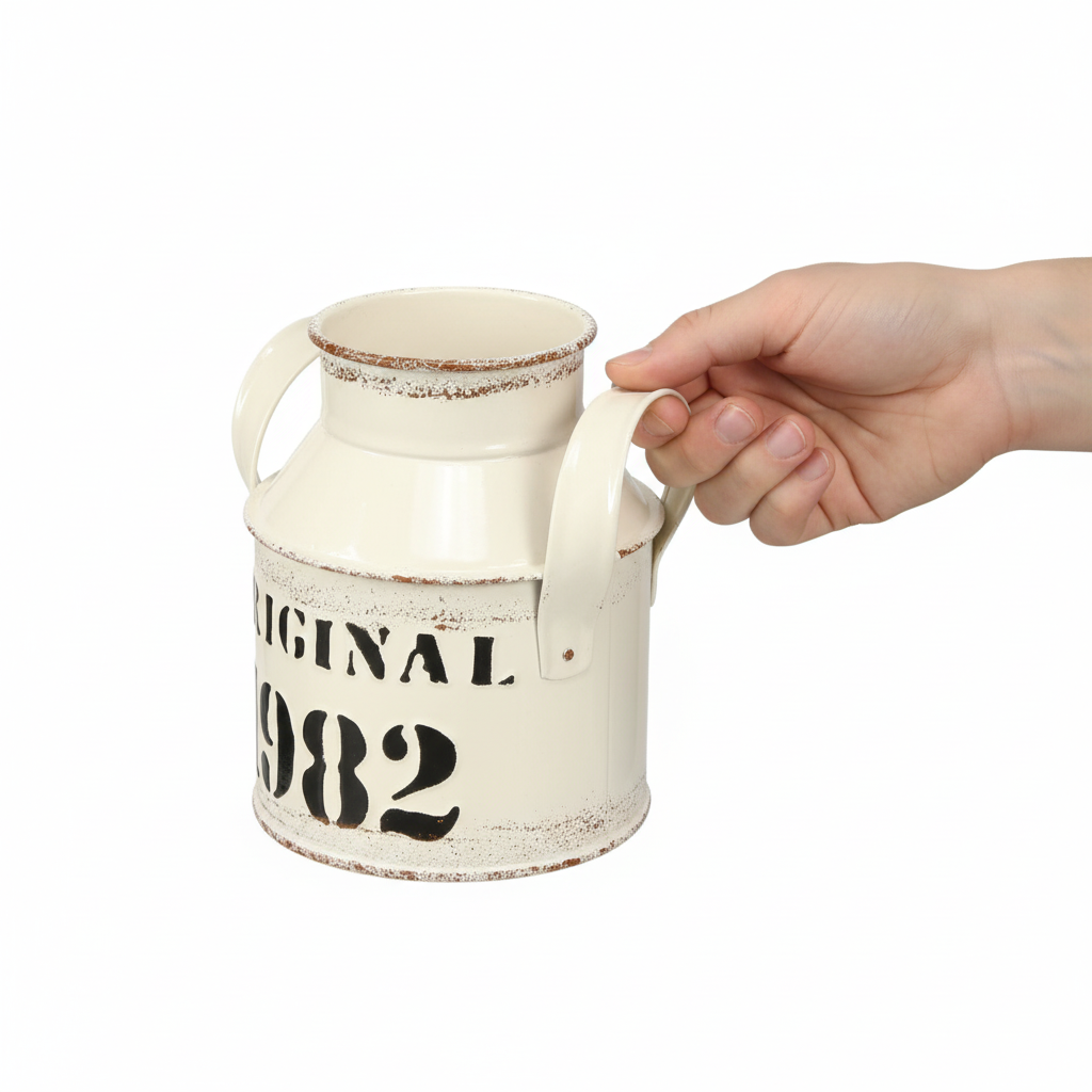 Onze decoratieve metalen kan met het opschrift “Original 1982” in crème- en roestlook combineert de charme van vervlogen tijden met modern design. Deze prachtige kan is ideaal voor iedereen die van vintage houdt en waardevolle accenten aan zijn of haar leefomgeving wil toevoegen. Uitgerust met twee praktische handgrepen kan de metalen decoratie eenvoudig worden verplaatst en neergezet om in elke kamer de aandacht te trekken. Het reliëf in zwart opschrift “Original 1982” onderstreept het nostalgische karakter van dit accessoire en maakt het tot een onmisbaar element in elk rustiek of landelijk geïnspireerd interieur. Ideaal als bloemenvaas voor droogbloemen of als decoratieve opberger in de tuin. Het voegt een vleugje authentieke vintage chic toe aan uw omgeving.