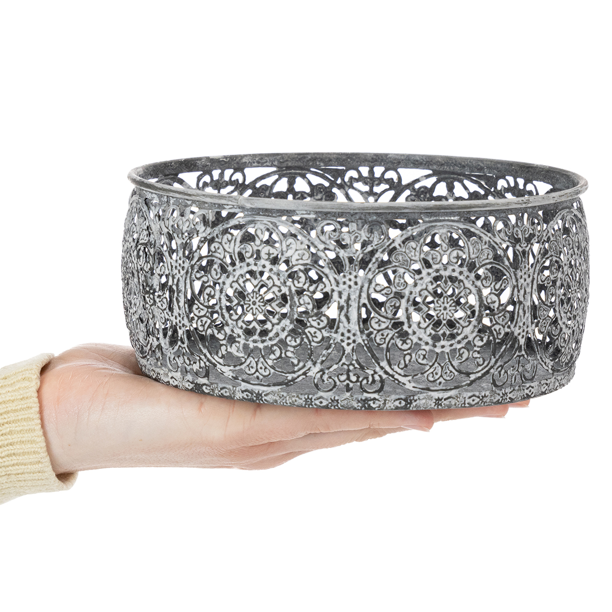 Deze metalen sierschalen, versierd met bloemmotieven, verfraaien tafels, ladekasten of dressoirs. De filigrane uitsparingen creëren betoverende decoraties aan de buitenkant van de metalen schalen.