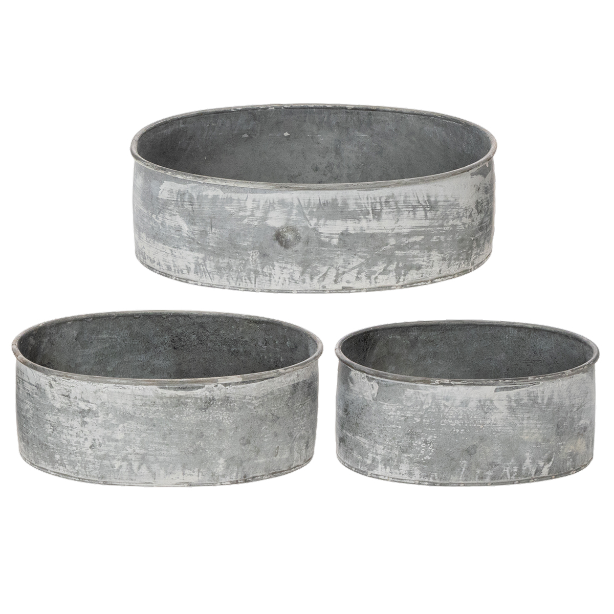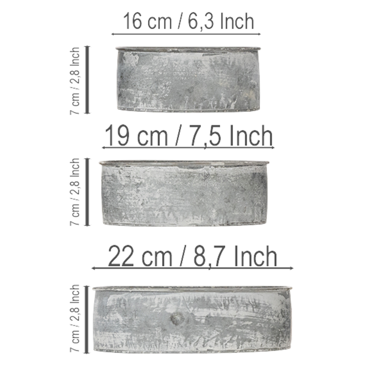 De drie schalen zijn gewassen in tijdloos grijs en wit en kunnen worden gebruikt voor zowel klassieke als vintage-achtige arrangementen. De metalen schalen zijn elegant vormgegeven met een afgeronde rand.