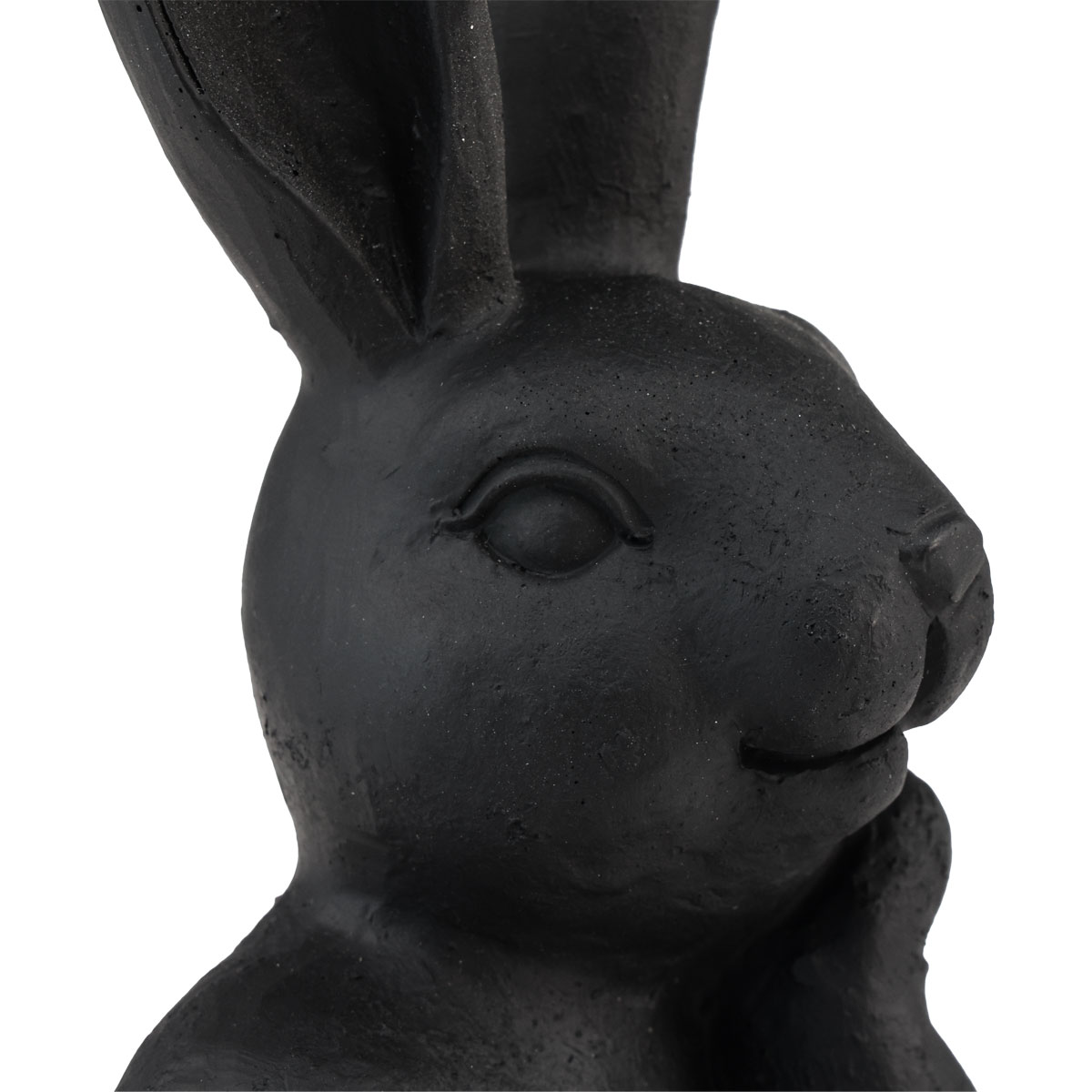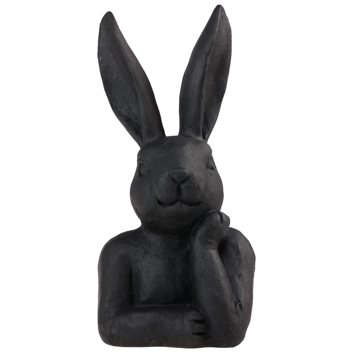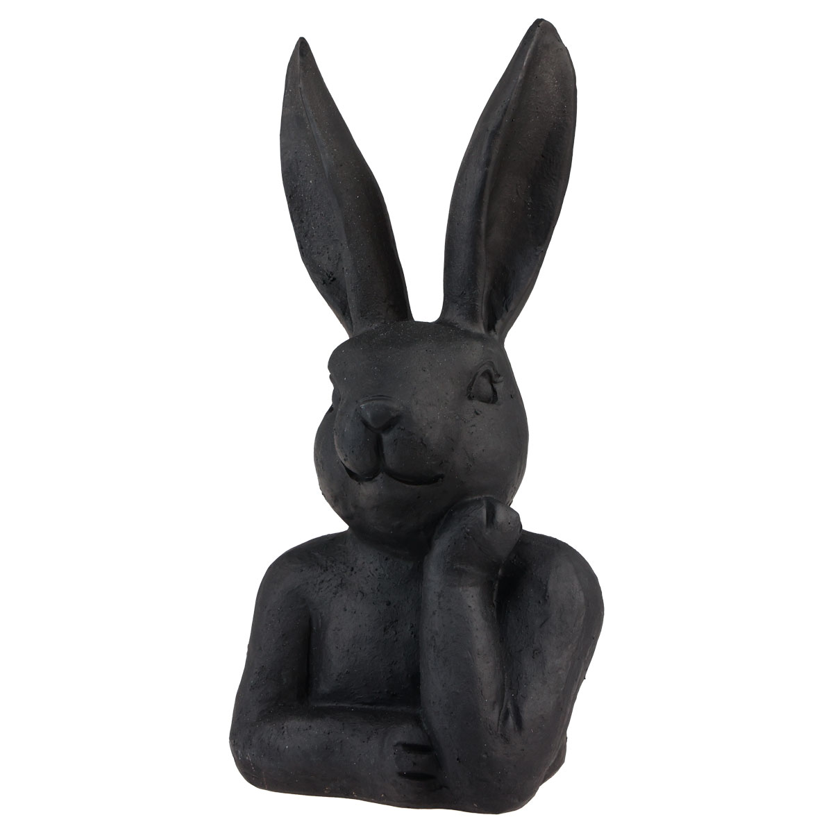 De paashaas lacht ondanks zijn nadenkende houding en is matzwart geverfd. Met de lange oren en het gedetailleerde gezicht ziet het decoratieve figuur er erg levendig uit. De zwarte kleur geeft het konijn echter elegantie.