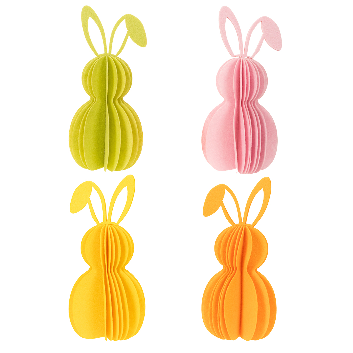 - Set van 4 decoratieve papieren konijntjes in geel, oranje, groen en roze.