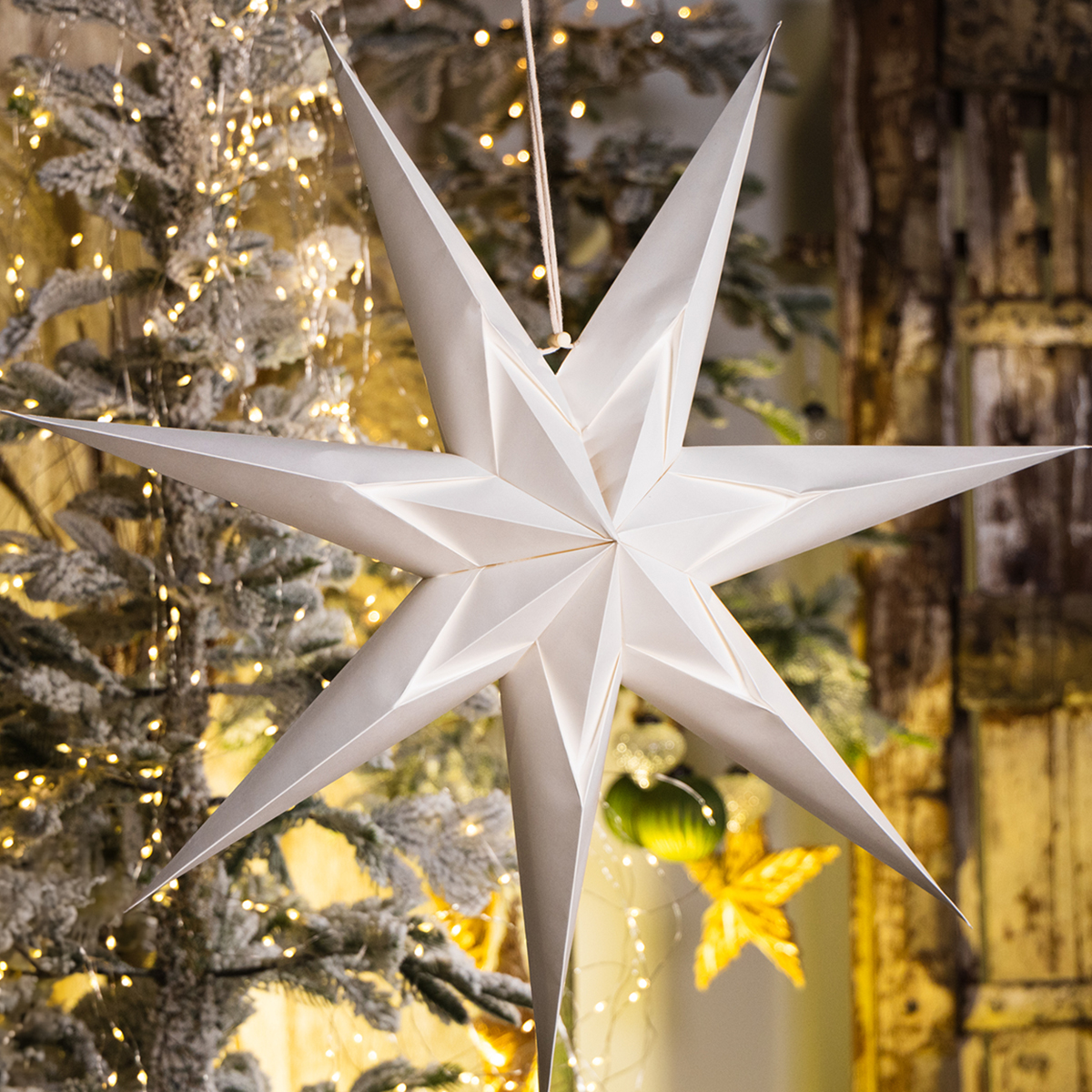 - Combineer de ster met lichtsnoeren en feestelijke takken voor een kerstarrangement.