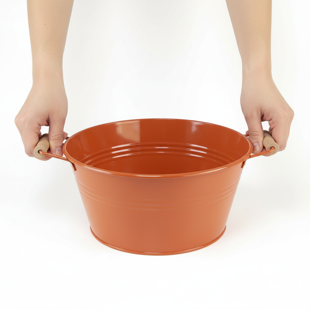 Warm en aardekleurig geverfd, glanst de decoratieve schaal nog mooier met groene planten. Bijzonder mooi zijn de handgrepen met gedraaide handgrepen van onbehandeld hout. De metalen kom ziet eruit als een kom die voorheen in huis en in de landbouw werd gebruikt.