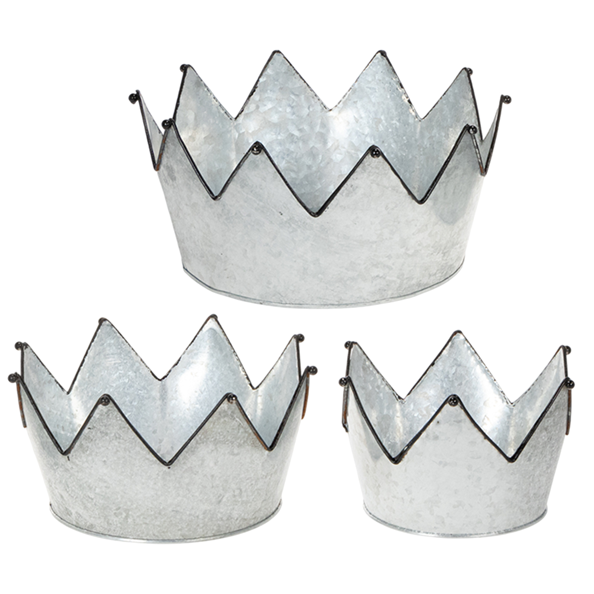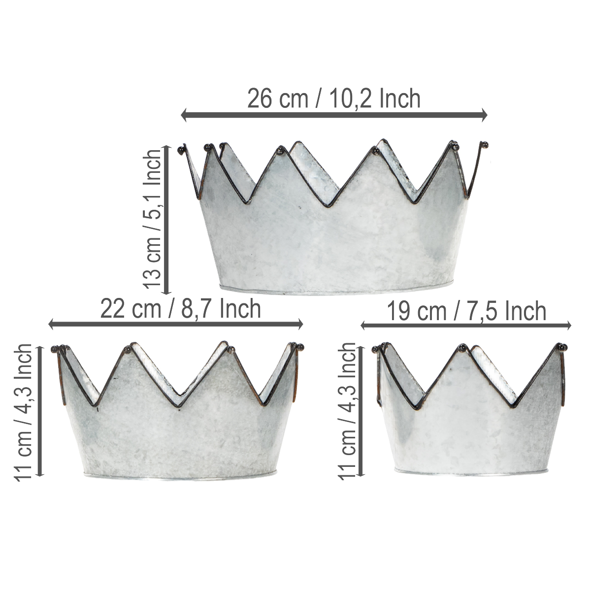 De drie metalen schalen van zink zijn gemaakt in verschillende maten. Wat ze gemeen hebben is de zwarte rand rond de stekels, die versierd zijn met een klein sierbolletje. De bal is ook zwart om bij de vintage decoratie te passen. De zwarte rand met decoratie maakt het voor iedereen duidelijk: er zijn hier drie kronen - klaar om te worden gevuld of gewoon om te worden geplaatst.