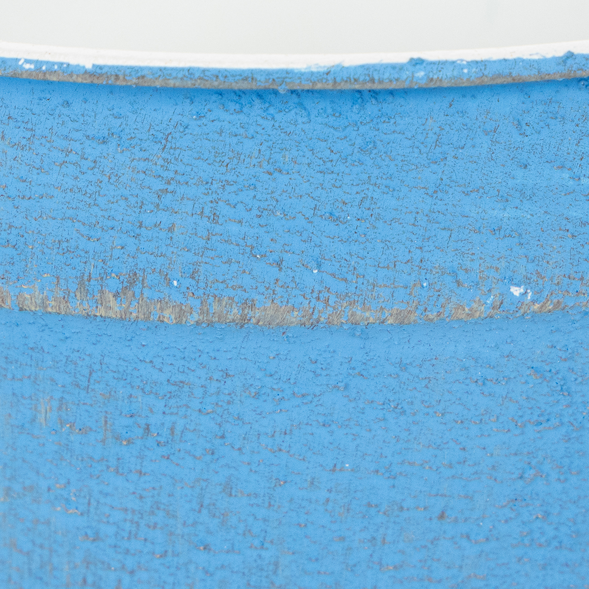 De decoratieve schaal is gemaakt van dun metaal en is daardoor erg licht. Binnenin is de sierpot wit, buiten schittert de metalen decoratie in het mooiste hemelsblauw. Door het geruwde oppervlak en grijze accenten oogt de plantenbak authentiek oud. Een kraal en twee kleine handvatten zorgen ervoor dat de decoratieve kom kan worden bedraad of indien nodig kan worden versierd met jute lint.