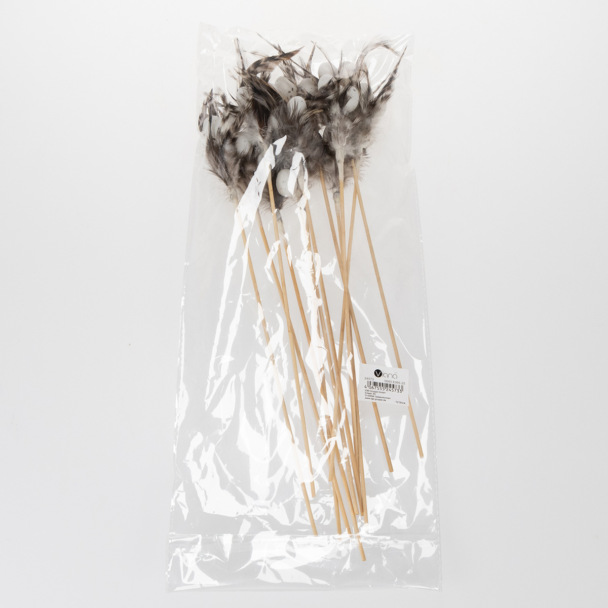 Productnaam: Decoratieve stokjes met veren, gemaakt van natuurlijke veren, paasdecoratie voor elegante arrangementen, 37 cm, 12 stuks