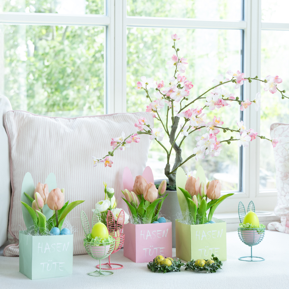 Deze 16 cm hoge konijntjes van draad voegen niet alleen een vrolijke touch toe aan je huis, maar zijn ook nog eens ongelooflijk veelzijdig. Hun luchtige ontwerp, gemaakt van hoogwaardig metaal, zorgt ervoor dat ze er zowel stevig als licht uitzien. De pastelkleuren geel, roze en groen harmoniëren prachtig met moderne interieurstijlen – van minimalistisch tot speels en lenteachtig. Een bijzonder praktische eigenschap: de konijntjes zijn open, waardoor je ze kunt vullen met wat je maar wilt. Of het nu kleine chocolade-eitjes, kleurrijke veren of zelfs een subtiel snoer LED-lampjes is – ze kunnen naar eigen inzicht worden aangepast. Voor een meer natuurlijke look kun je ze ook vullen met mos of gedroogde bloemen om een uniek paastafereel te creëren. Gebruik de konijntjes als bijzondere tafeldecoratie voor je paasbrunch of als charmante verrassing op de vensterbank: je gasten zullen er blij mee zijn! Ben je dol op creatieve doe-het-zelfprojecten? Probeer de draadkonijntjes dan eens te combineren met bloemen uit je bloemenwinkel. Soortgelijke decoraties uit dezelfde kleurgroep werken het beste – probeer het eens!
