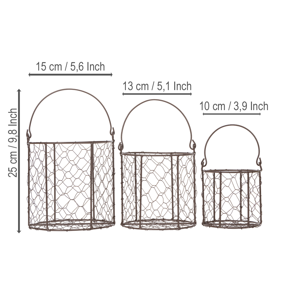 Deze set van drie draadmanden is een echte aanrader. Gemaakt van stevig metaal en uitzonderlijk duurzaam dankzij het fijne gaas, vormen ze de perfecte aanvulling op elk modern interieur. Met een diameter van 15 cm (grootste mand) en een hoogte van 25 cm bieden ze ruimte aan vrijwel alles wat u georganiseerd wilt opbergen. Fruit en groenten? Geen probleem. Keukengerei of stoffen servetten? Perfect. Of misschien geeft u de voorkeur aan een decoratieve touch? Planten en bloemen komen in deze manden prachtig tot hun recht. Dankzij hun ronde vorm en stevige draaghendel zijn de manden gemakkelijk te verplaatsen van kamer naar kamer of naar de tuin. Liefhebbers van de vintage stijl zullen er direct door gecharmeerd zijn. De bruine kleur zorgt ervoor dat de set harmonieus in elk interieur past – van Scandinavisch minimalisme tot rustieke landelijke stijl. De manden staan vooral mooi in combinatie met andere decoratieve elementen van natuurlijke materialen. Waarom probeert u ze niet eens?