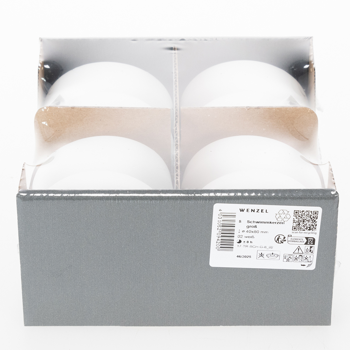 De witte, drijvende kaarsen worden geleverd in een set van 8. Elke kaars heeft een diameter van ongeveer 8 centimeter en een hoogte van 4 centimeter, met een brandtijd van ongeveer 8 uur.