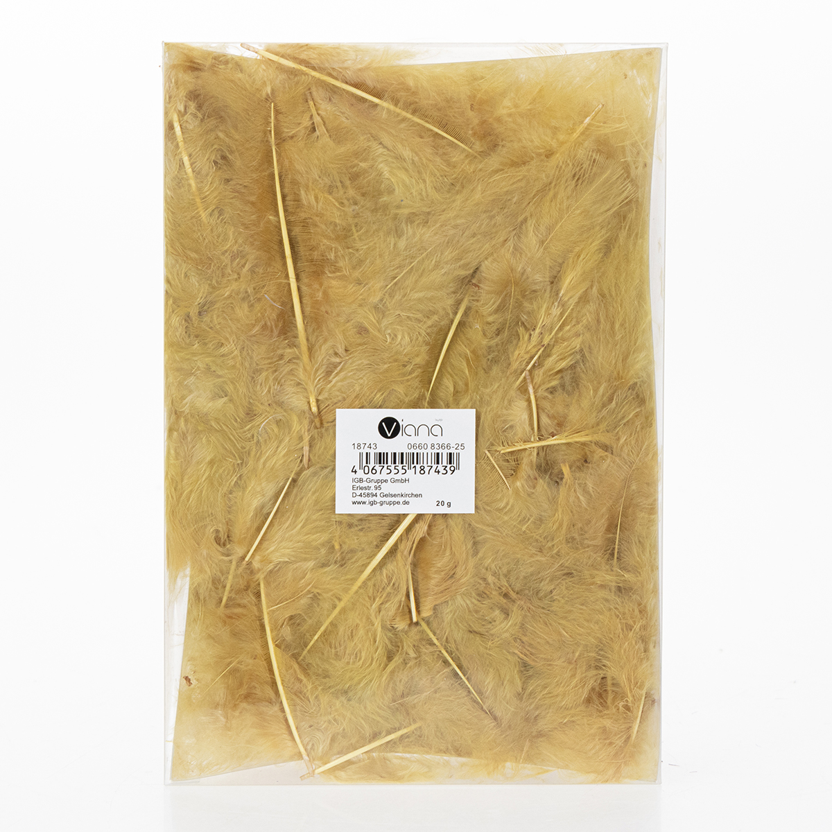 Ontdek de delicate en donzige lichtgele veren, die met hun zachte kleur het perfecte knutselmateriaal zijn voor creatieve geesten. Deze echte vogelveren, die tussen de 5 en 10 cm lang zijn, zijn ideaal voor allerlei creatieve projecten. Of het nu gaat om een voorjaarstafeldecoratie, in een paaskrans of als bijzonder accent in bloemstukken - de mogelijkheden zijn bijna eindeloos. In de verpakking met een nettogewicht van ongeveer 20 gram vinden doe-het-zelvers, evenementenplanners of hobbyisten genoeg materiaal om hun creativiteit de vrije loop te laten. Lichtgele veren geven elk project een zachte lichtheid en kunnen prachtig gecombineerd worden met andere kleuren en materialen. De symbolische betekenis van geel als teken van geluk en optimisme maakt deze veren de ideale keuze voor lentedecoraties. Profiteer van de verscheidenheid aan gebruiksmogelijkheden en creëer unieke creaties die gegarandeerd de aandacht trekken.
