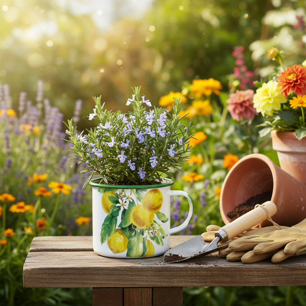 Plant of zaai de gewenste planten in de geëmailleerde decoratieve beker en plaats de plantenbak vervolgens effectief op een vensterbank als bloemdecoratie of gebruik de metalen beker als een mooie tafeldecoratie. De kleine mok met handvat ziet er ook geweldig uit als tuindecoratie en kan decoratief geplaatst worden op een tuinmuur, een boomstronk of een bordes! - Of je kunt de metalen beker gebruiken als kruidenpotje als een klein cadeautje voor de volgende uitnodiging.