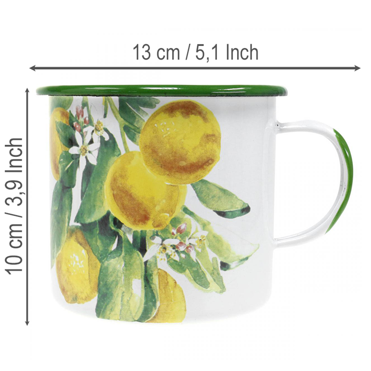 De beker voor het planten is gemaakt van metaal, dat is geëmailleerd. De plantenbak is aan beide zijden gedecoreerd met een citroenmotief van fruit, bloesem en blad. – De achtergrond, binnenkant en handgreep van de plantenbak zijn wit gehouden. Een groene streep siert de opening en het handvat.