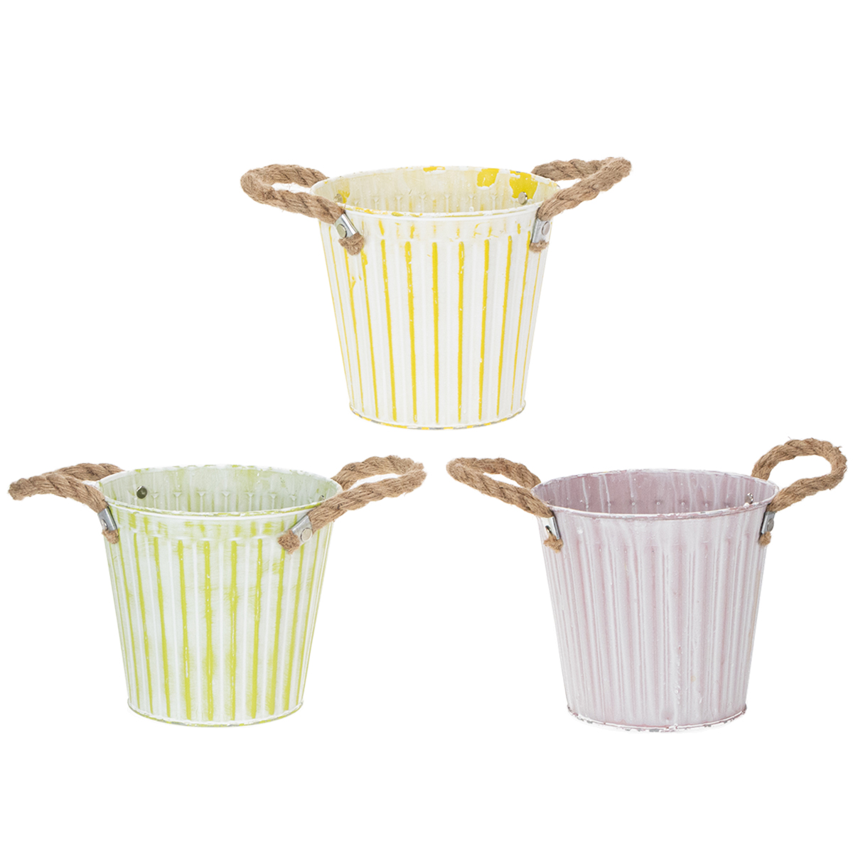 Emmer voor planten, plantenbak met handvatten, metalen decoratie roze/groen/geel shabby chic Ø16,5cm H15cm 3-delige set