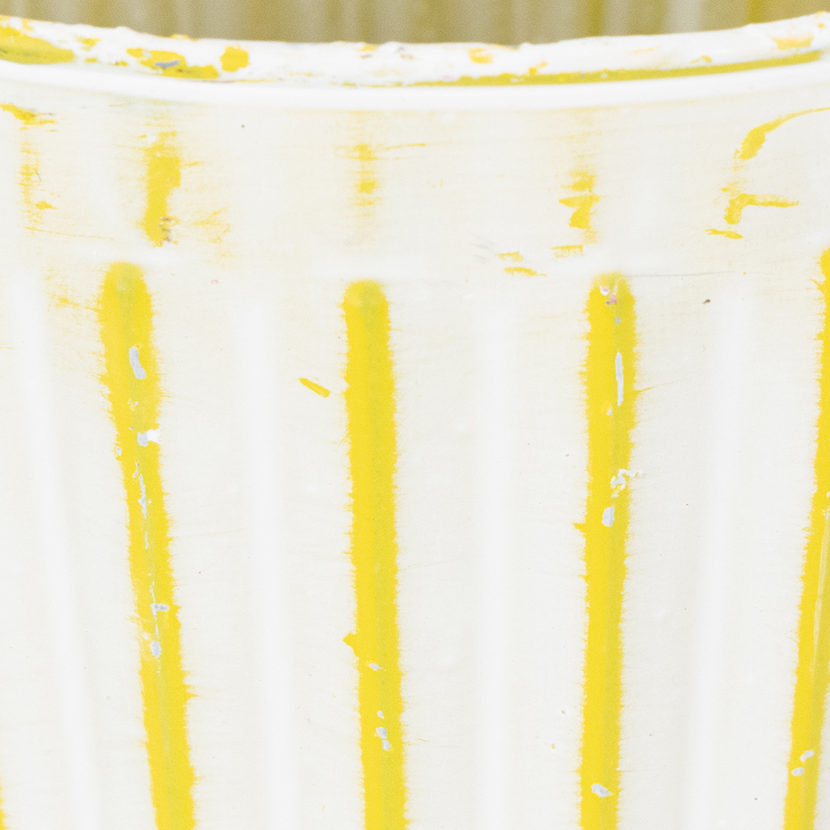 De ronde plantenpotten komen naar je toe in een set in pastelroze, groen en geel en zijn gewassen in trendy shabby chic wit. Een rondom, gelijkmatig verticaal reliëf geeft de metalen pot een moderne, grafische uitstraling.