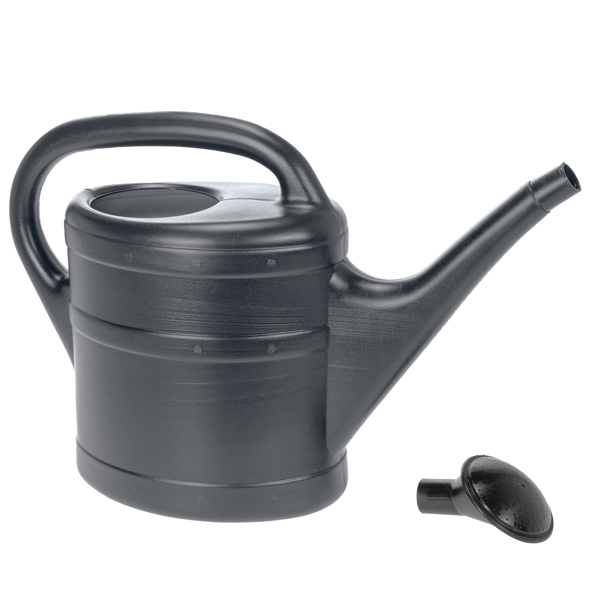 De antracietkleurige gieter heeft een inhoud van maximaal 5 liter en wordt geleverd met een sproeikop.