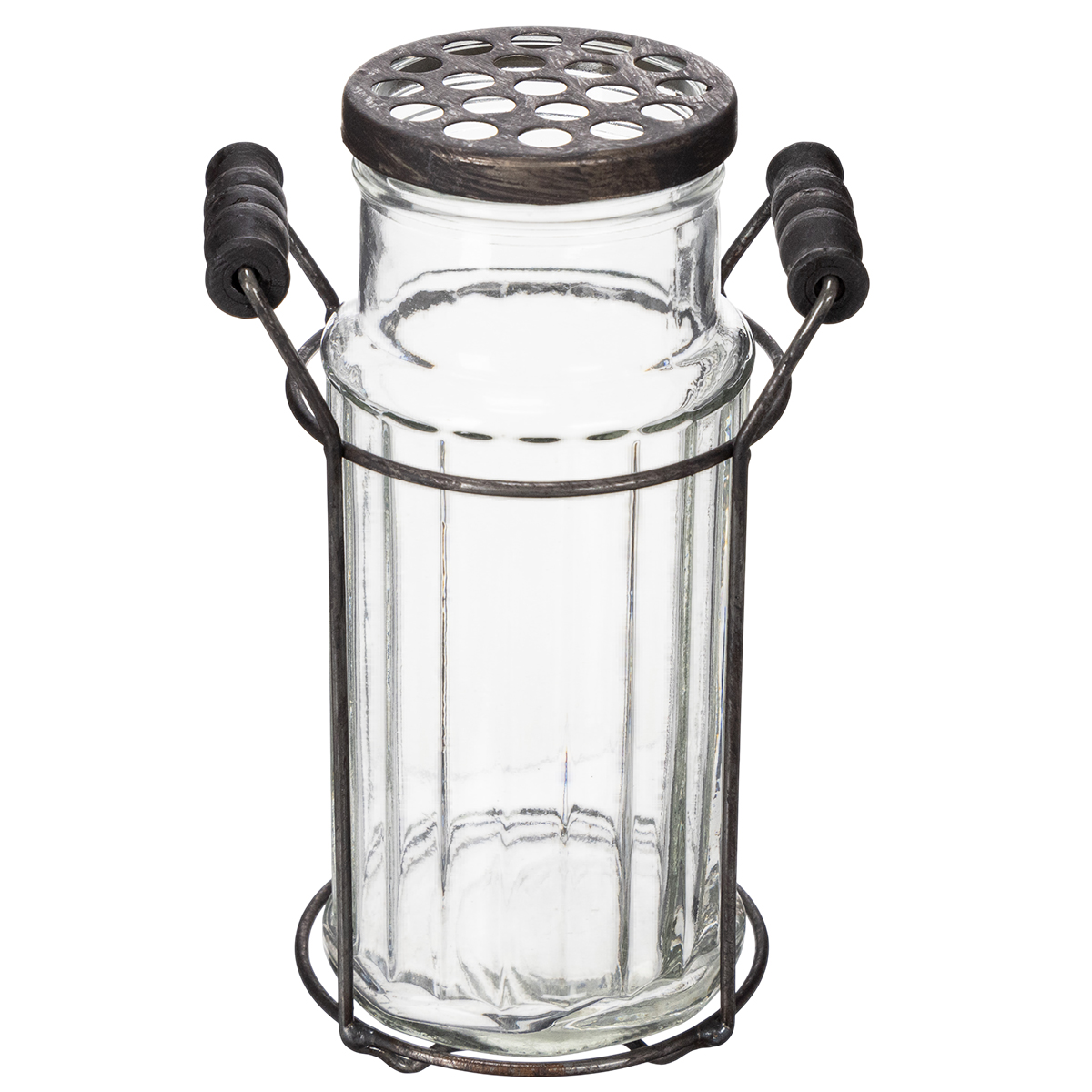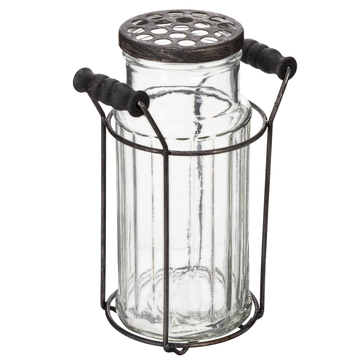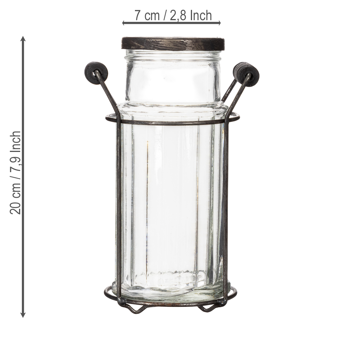 Op zoek naar een tijdloos decoratief item? Deze glazen fles met metalen mandje is niet alleen functioneel, maar ook een echte blikvanger. Met zijn transparante oppervlak en rustieke metalen houder straalt hij een charmante vintage sfeer uit die naadloos in vrijwel elk interieur past. Of het nu op de salontafel, in de keuken of als creatieve vaas is – dit item trekt gegarandeerd de aandacht! En weet je wat nog beter is? De gaatjes in het deksel nodigen je uit om er op stijlvolle wijze individuele bloemen in te zetten. In een handomdraai creëer je een klein kunstwerkje.