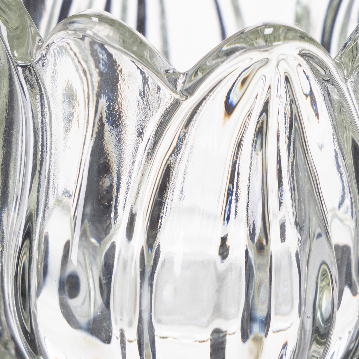 Deze theelichthouder combineert op vakkundige wijze tijdloze elegantie met praktische functionaliteit. Gemaakt van hoogwaardig, helder glas, maakt hij indruk met zowel zijn robuuste constructie als zijn verfijnde, bloemvormige ontwerp. Het transparante oppervlak laat de delicate bloemvorm prachtig uitkomen, waardoor het een decoratief hoogtepunt is, niet alleen als lichtbron, maar ook wanneer hij leeg is.