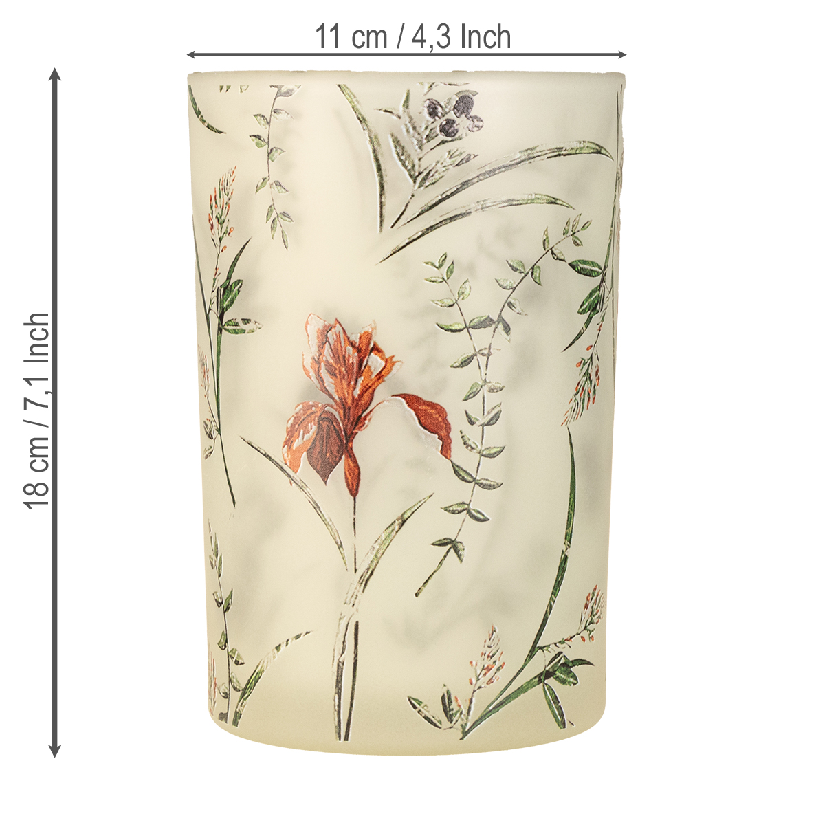 De glazen theelichthouder met bloemenmotief is meer dan zomaar een kaarsenhouder – het is een stijlvol accessoire voor in huis. Het delicate bloemenpatroon in beige, groen en rood geeft de houder een natuurlijke en harmonieuze uitstraling die prachtig past bij een vintage of landelijke inrichting. Dankzij het handgemaakte ontwerp is elke houder uniek. Met een hoogte van 18 cm en een diameter van 12 cm biedt hij voldoende ruimte voor zowel standaard theelichtjes als decoratieve kaarsen. Het hoogwaardige glas laat licht en warmte prachtig doorschijnen – een effect dat vooral in gedempt licht magisch oogt.