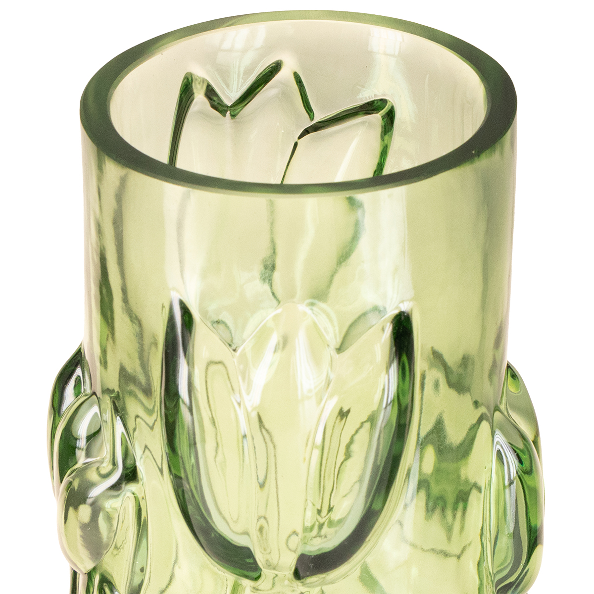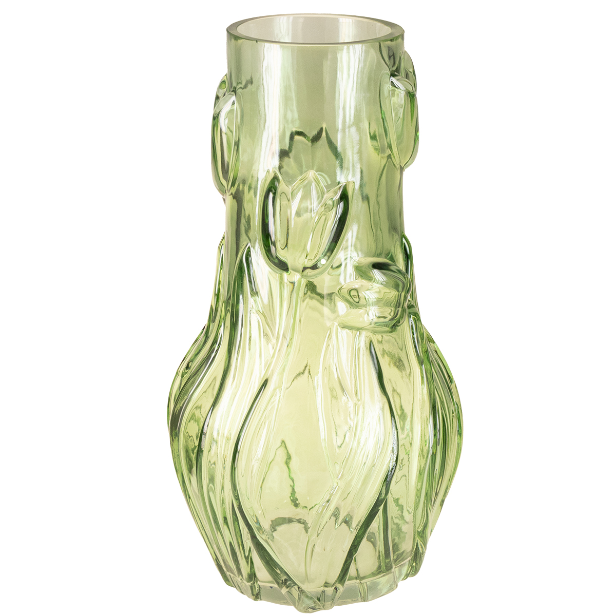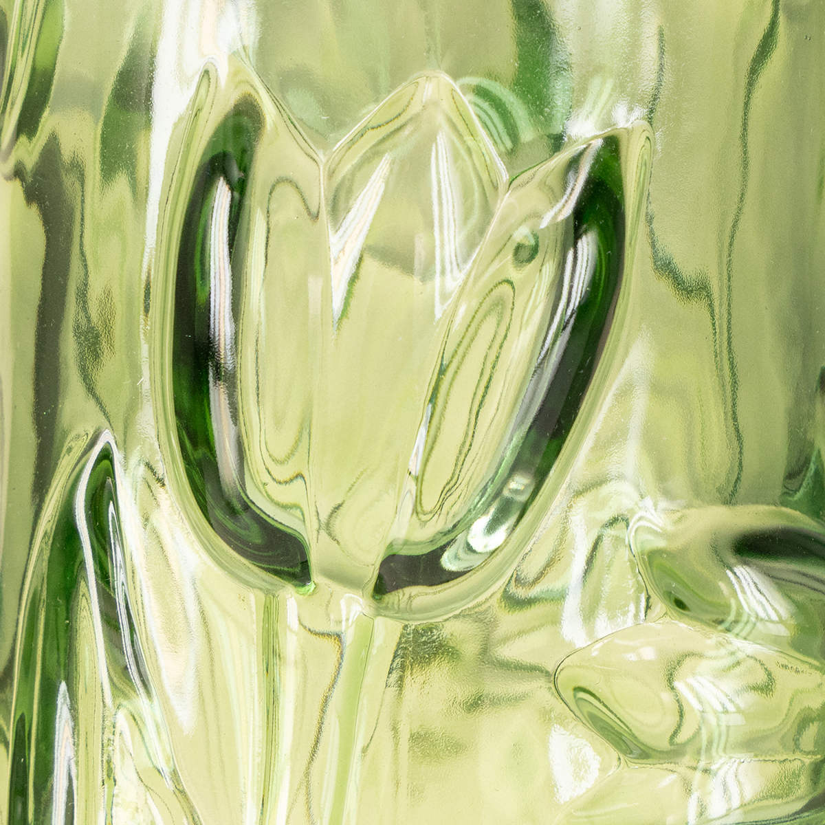 Glazen vaas met reliëf van een tulp voor een harmonieuze kamerinrichting, 30 cm.