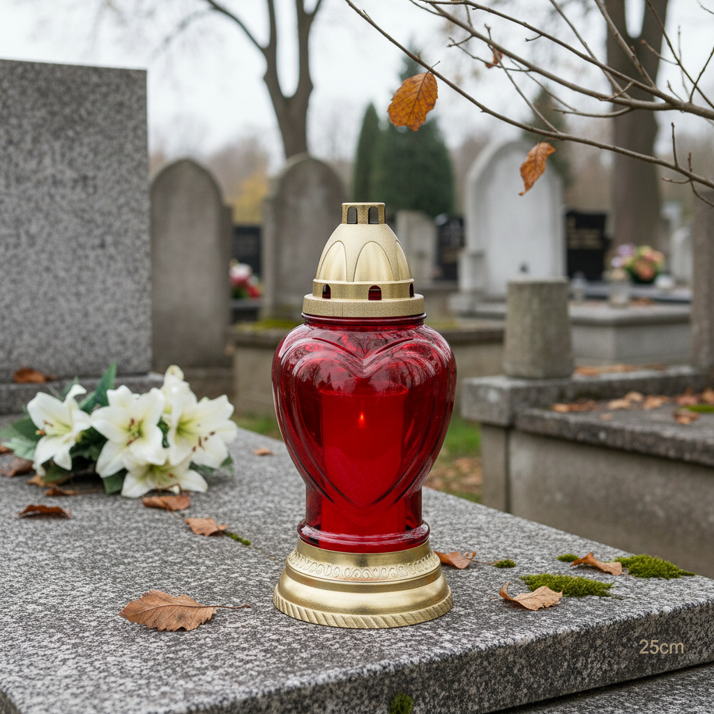 De graflantaarn is aan beide zijden versierd met een tijdloos hartreliëf, wat de graflantaarn een stijlvolle uitstraling geeft. De deksel en voet zijn van kunststof en eveneens fraai vormgegeven.